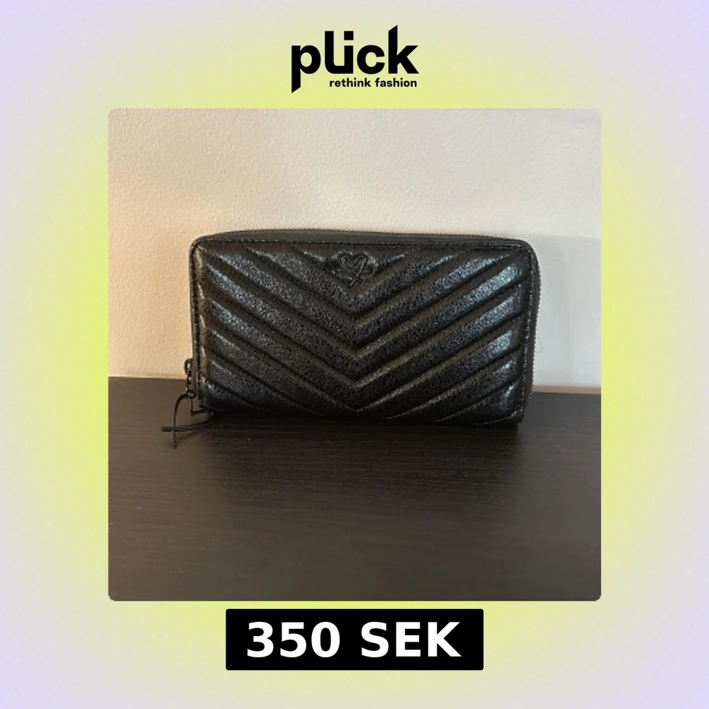 Snygg svart plånbok med quiltat mönster och dragkedja. Den har flera fack för kort och sedlar, samt en hjärtformad dragkedja. Perfekt för att hålla ordning på dina tillhörigheter med stil.
