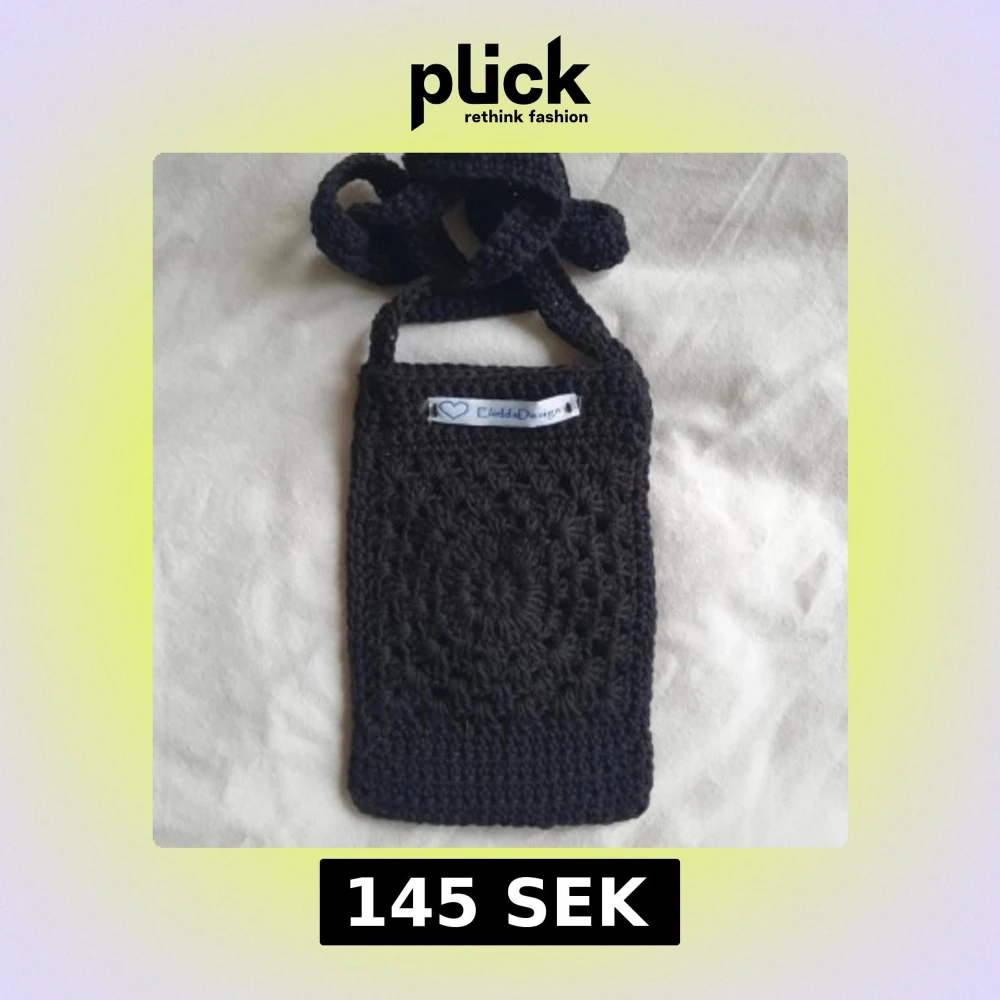 Säljer en svart virkad axelväska från ElindaDesign. Väskan har ett unikt mönster framtill och en bred axelrem. Perfekt för att bära mobilen eller småsaker. Enkel och stilren design med handgjord känsla.