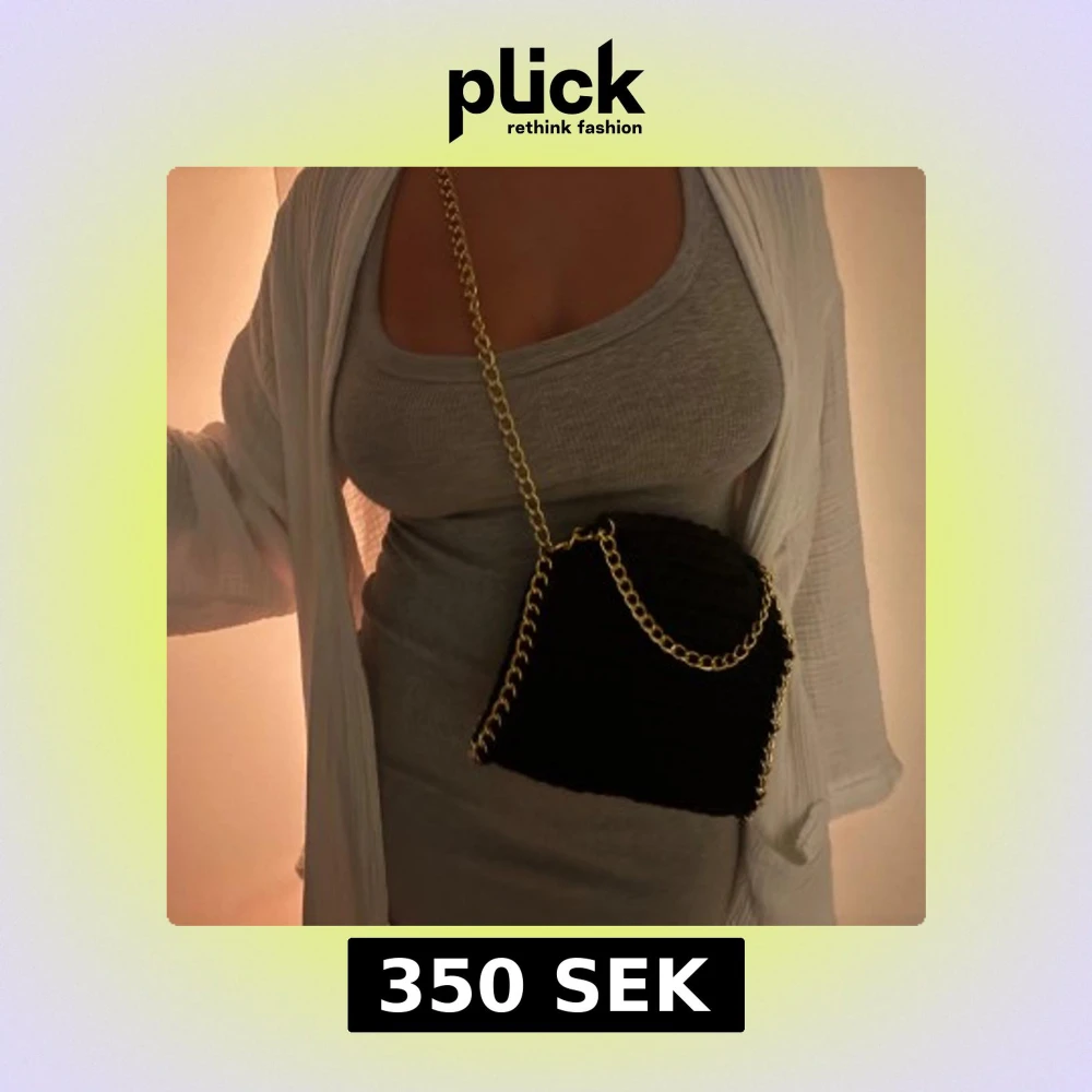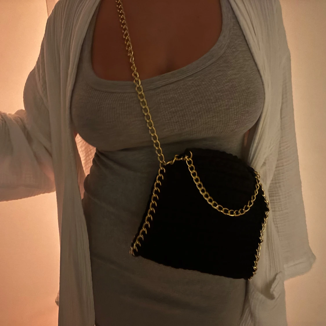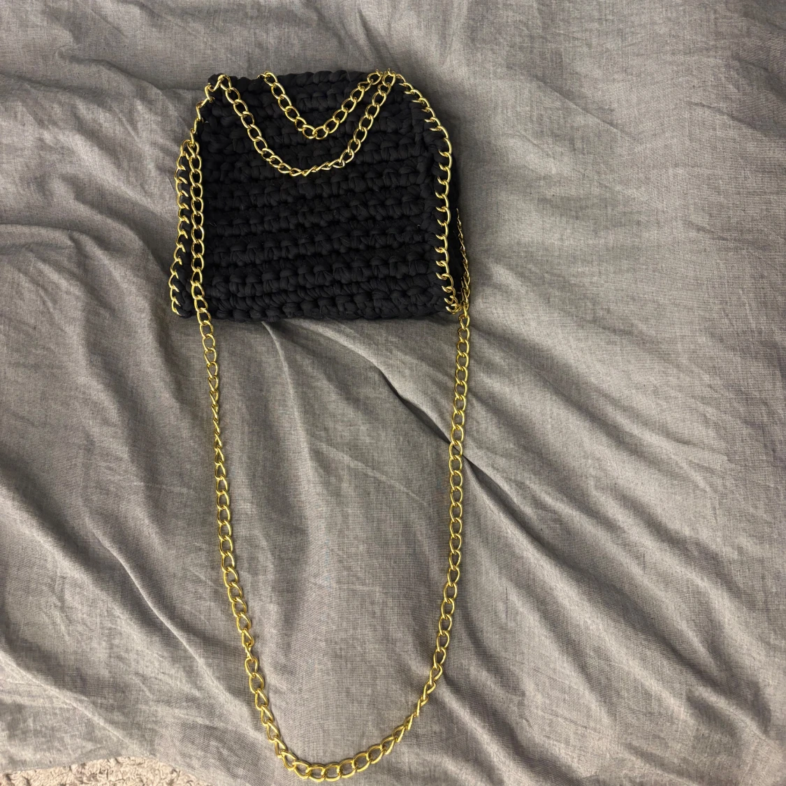 Säljer en mörkblå virkad axelväska med snygg guldfärgad kedja som axelrem. Väskan är köpt av ett gammalt Uf företag och är därför väldigt unik och går inte att köpa längre.