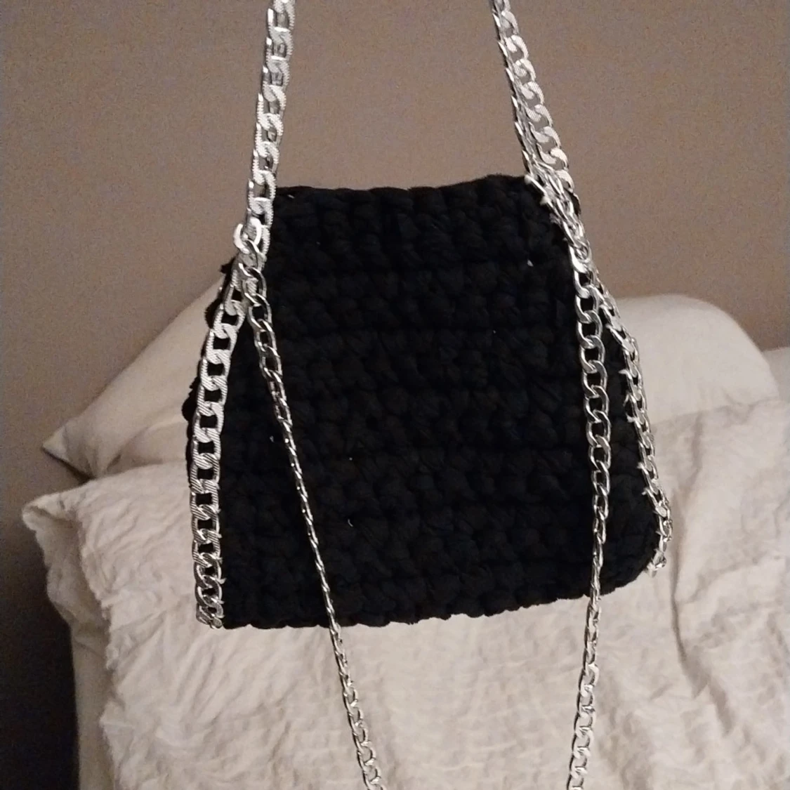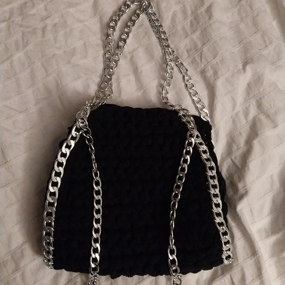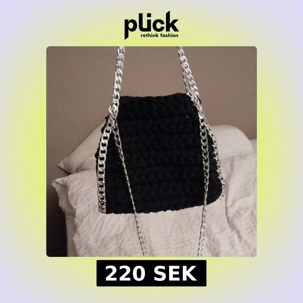 Snygg svart stickad väska med coola silverfärgade kedjor. Perfekt för att ge din outfit en edgy touch. Väskan har en unik textur och är både stilren och praktisk.