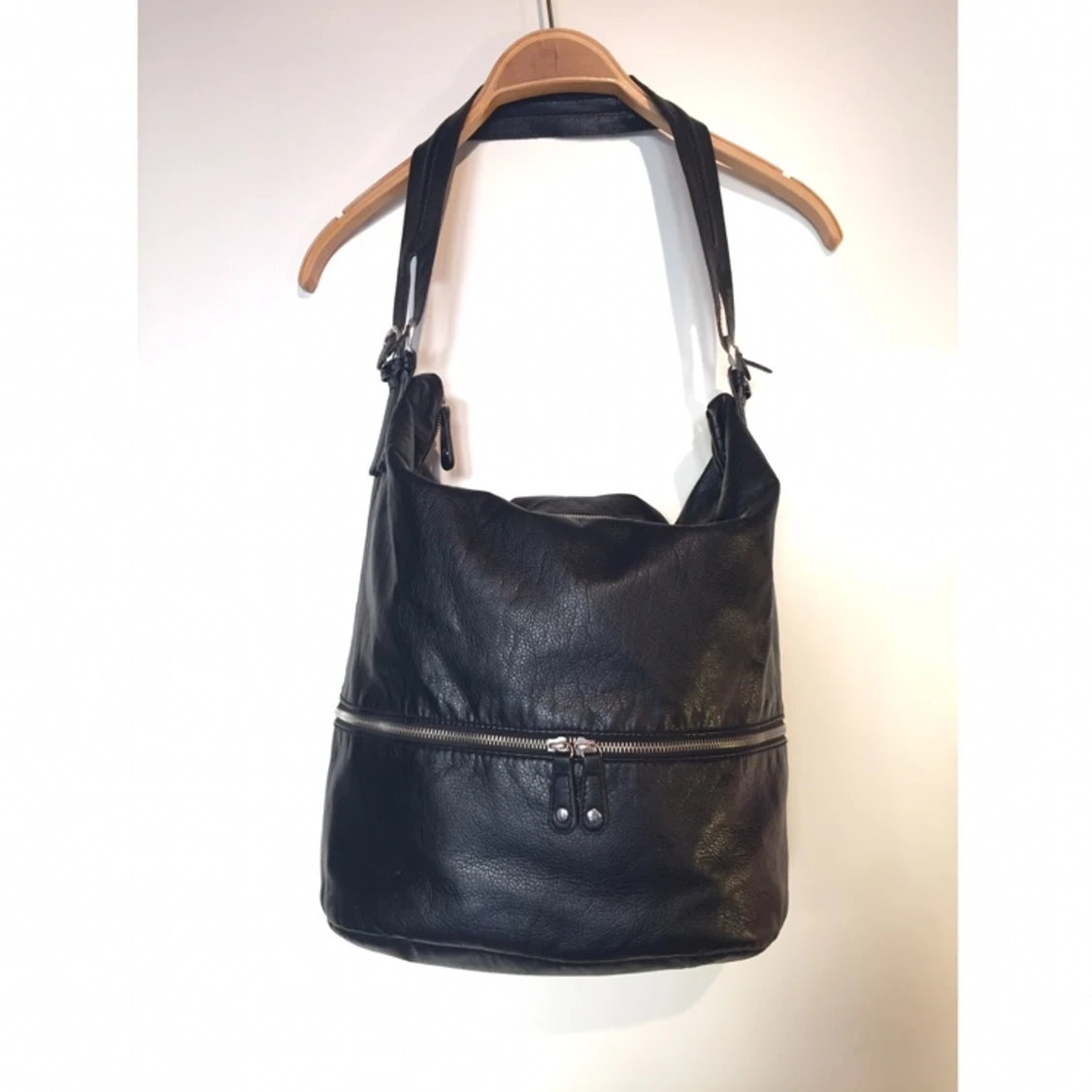 Medelstor väska i konstgjort läder. Två fickor på utsidan med dragkedjor och två fickor på insidan varav en med dragkedja. Fint skick
