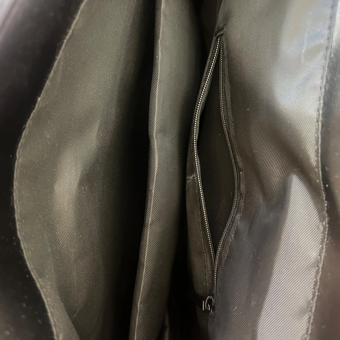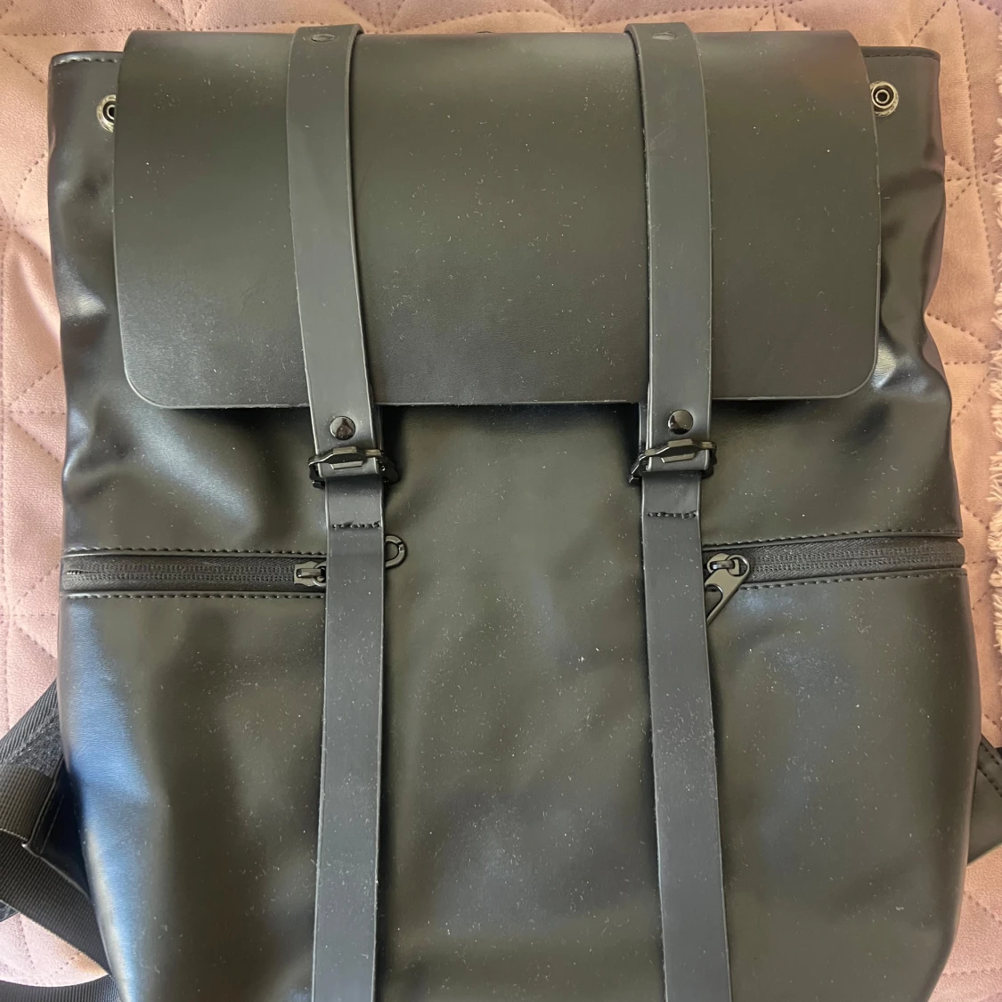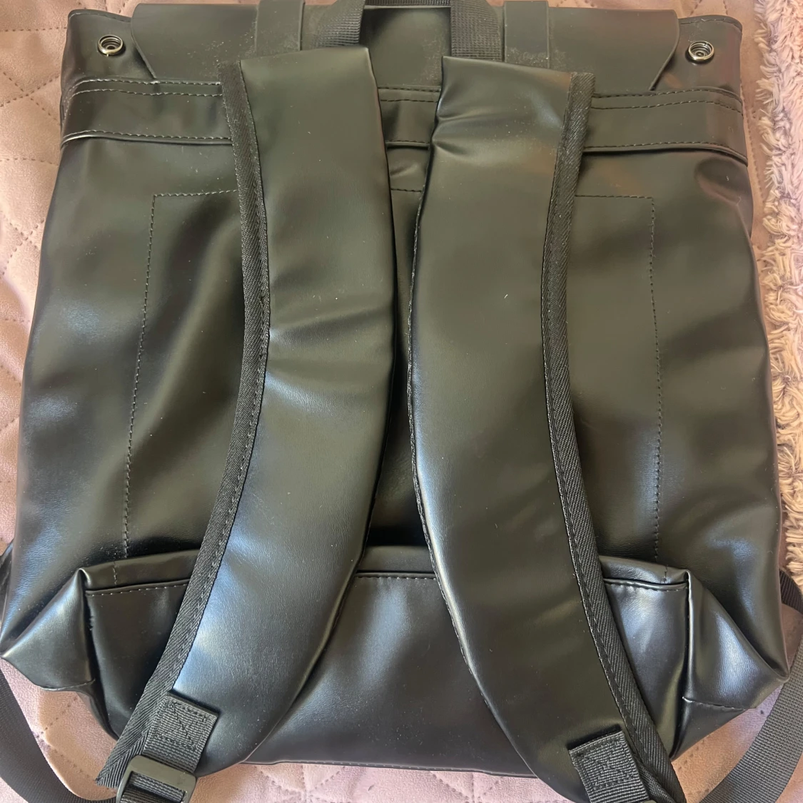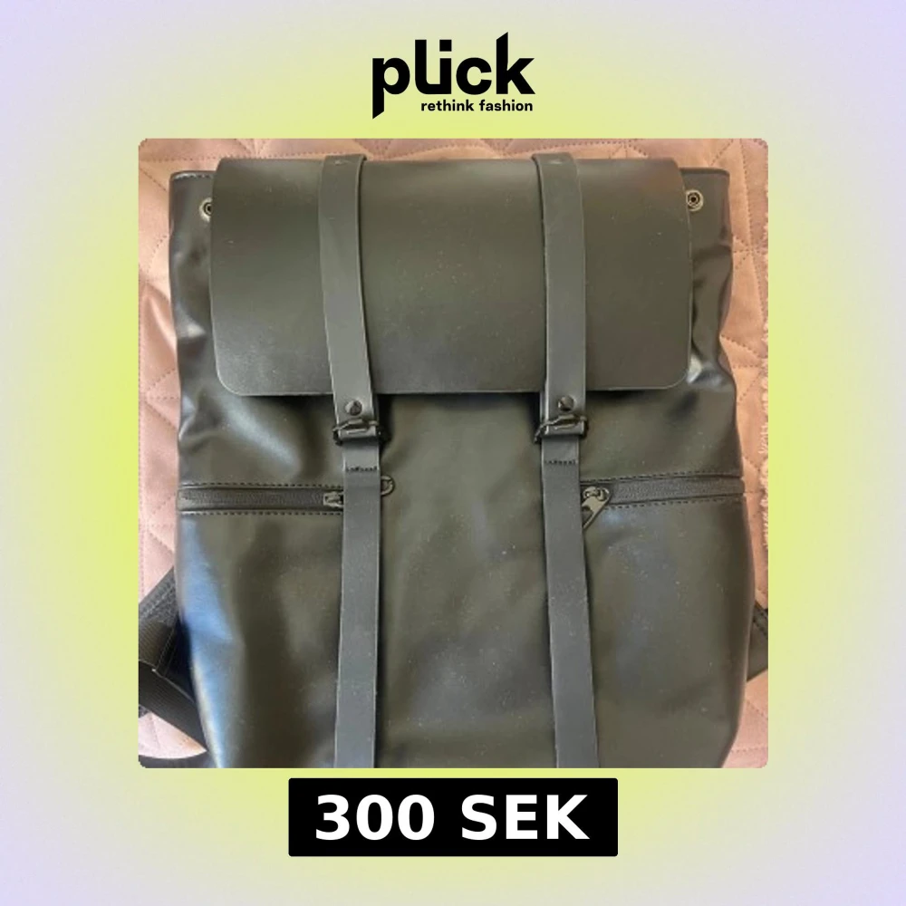 Snygg svart ryggsäck med vattentätt material, justerbara axelband och stort utrymme. Tillverkad i slätt syntetmaterial med dragkedjefack både på utsidan och insidan. Perfekt för skola eller jobb, rymmer dator och böcker och lite till! Använd ca 2 gånger. Nypris=400kr