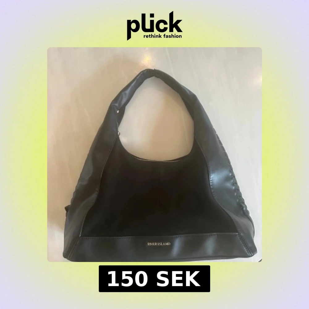 Snygg svart axelväska från River Island med mjuk form och bred axelrem. Väskan har detaljer i skinn och mocka, guldfärgad dragkedja och flätad kant på sidan. Perfekt storlek för allt du behöver och stilren look.