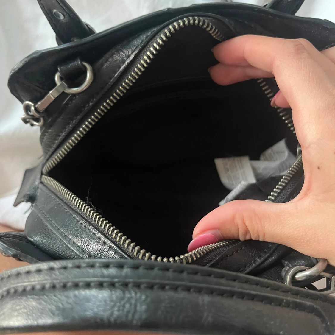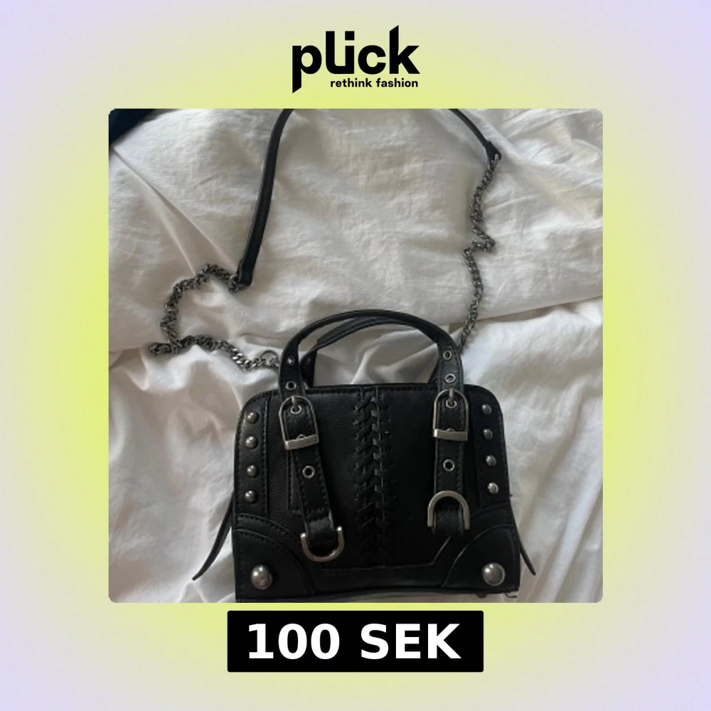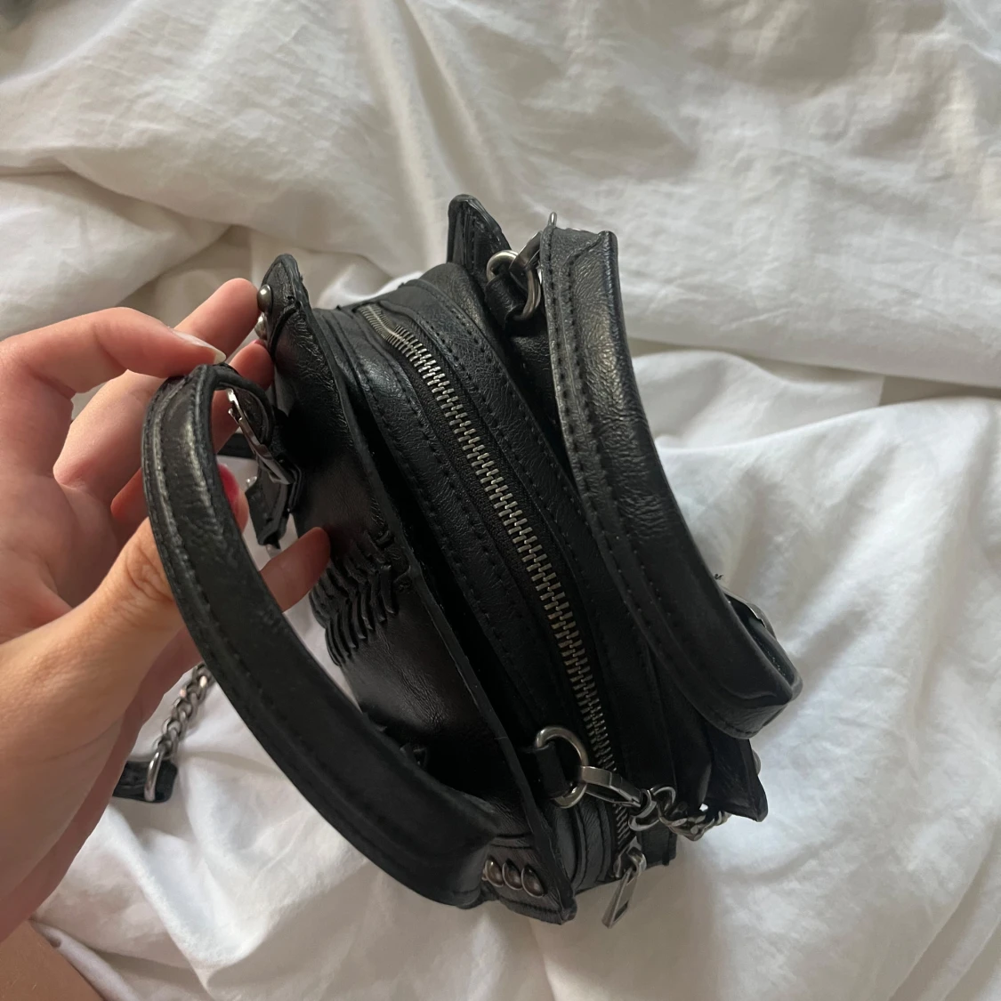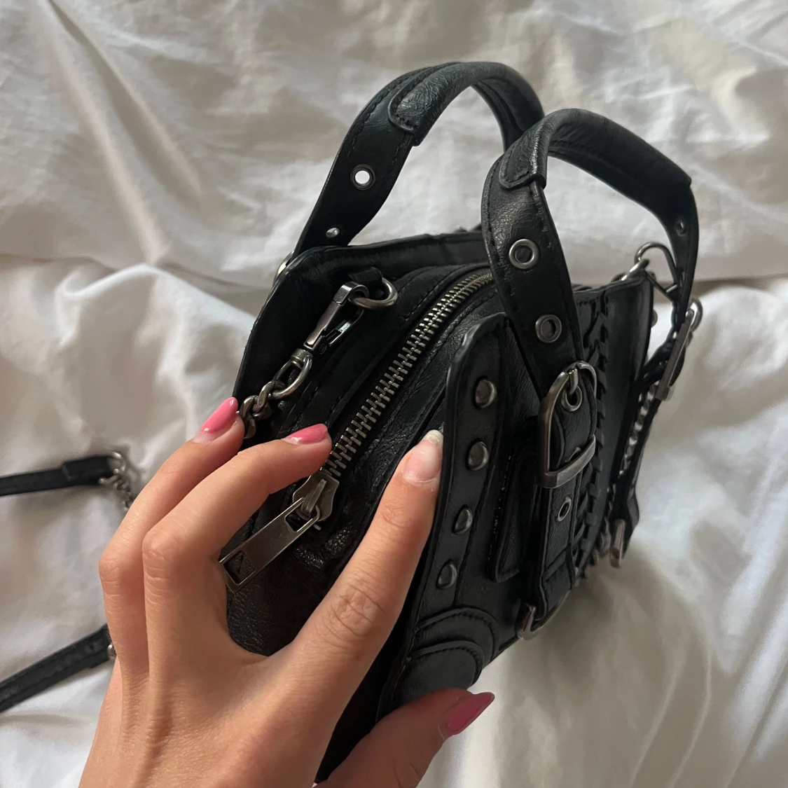 Jag säljer nu min fina väska från Zara. Cool svart handväska i skinn med silverfärgade detaljer, kedja som axelrem och snygga nitar på sidorna. Väskan har två handtag, dekorativa spännen och snörningsdetalj framtill. Dragkedja upptill och rymligt fack inuti.