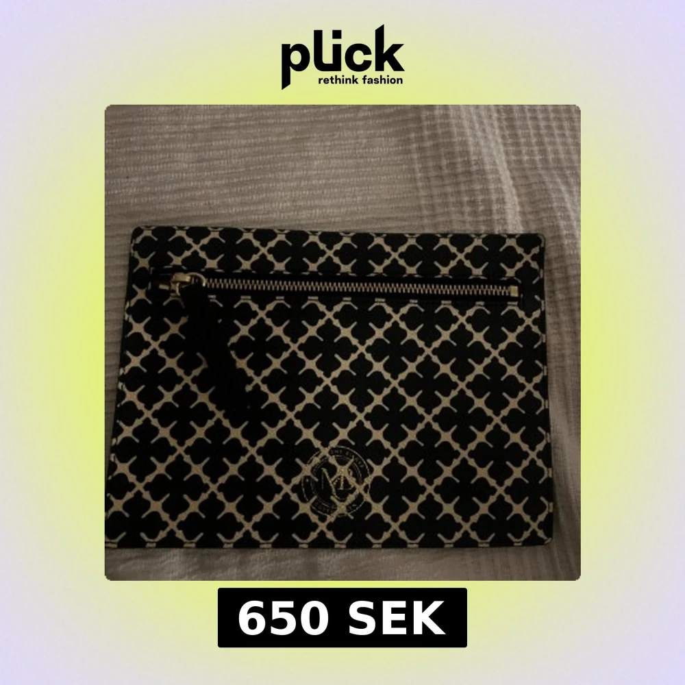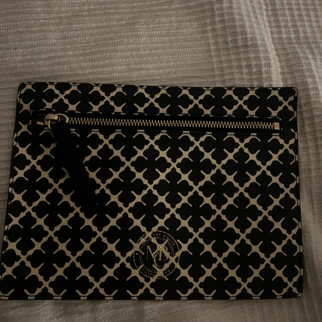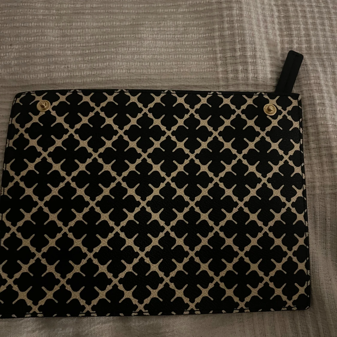 Snygg kuvertväska från By malene birger i svart och vitt med grafiskt mönster och guldfärgad logga framtill. Väskan har en dragkedja med svart läderdetalj och är tillverkad i ett tåligt syntetmaterial. Perfekt för att bära det viktigaste med stil.