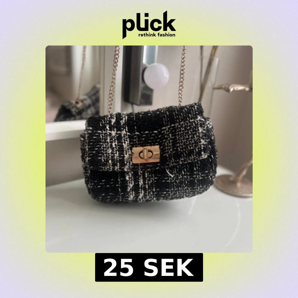 Snygg svartvit axelväska i rutigt tyg med grov struktur och guldfärgad kedja. Väskan har ett lock med vridspänne i guld och är perfekt för att lyfta vilken outfit som helst. Den är kompakt men rymmer det viktigaste och har en trendig vibe.