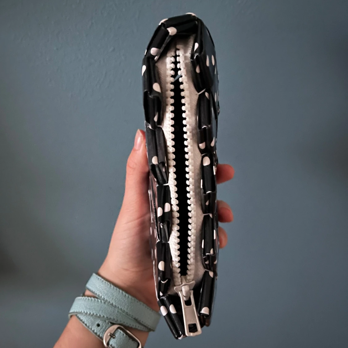 Cool kuvertvĂ€ska som Ă€r fin i alla tillfĂ€llen! BĂ„de necessĂ€r & clutch.đĂlskar prickarna. Köpt second hand i Danmark- ser ut att vara handgjordâïž
