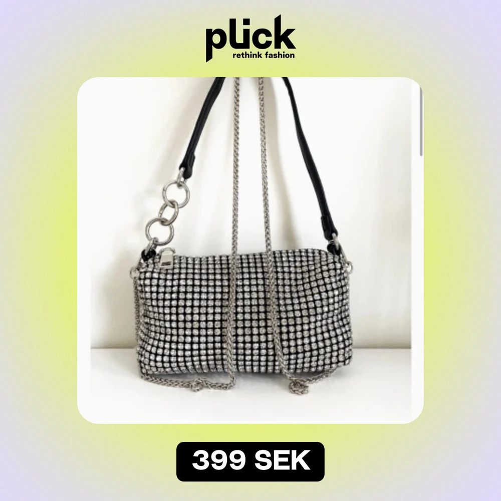 Fin väska med strass stenar. Stängs med dragkedja. Fack för kort på insidan, svart foder, crossbody rem/kedja. Mått: Ca 20 x 15 x 7 cm Skick: Väskan har förlorat 2 stenar, en på undersidan och en på ena sidan. Kan lätt ersättas med nya stenar.
