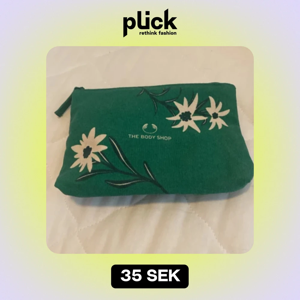 En grön necessär från The Body Shop med vita blommor och gröna blad som dekoration. Väskan har en dragkedja för stängning.