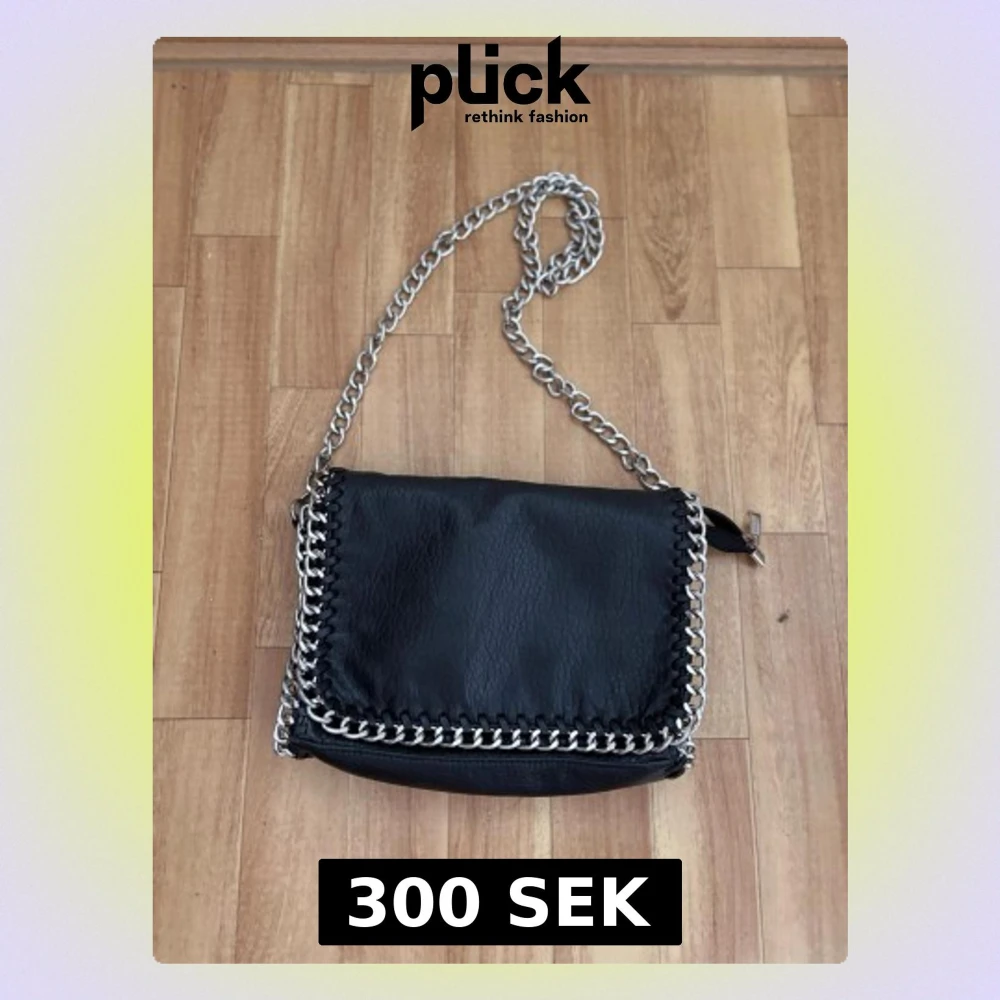 Snygg svart axelväska med silverfärgad kedjerem och kedja runt kanterna. Väskan har ett lock framtill och en dragkedjeficka på baksidan.