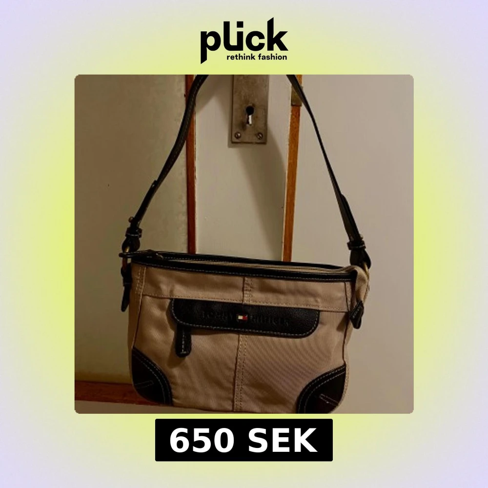 Snygg beige axelväska från Tommy Hilfiger med svarta detaljer i skinn och tydlig logga framtill. Väskan har justerbar axelrem, dragkedja upptill och praktiska fack. Perfekt storlek för det viktigaste och stilren design som lyfter din outfit. Inte fast pris, kan diskuteras