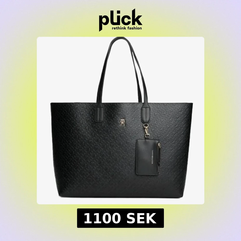 Stilren svart shoppingväska från Tommy Hilfiger med präglat mönster och guldfärgad logga. Väskan har dubbla handtag och en avtagbar liten plånbok med dragkedja. Helt oanvänd, köpte med ett köp och sen åkt utomlands så retur gälldes ej när jag väl kom hem.