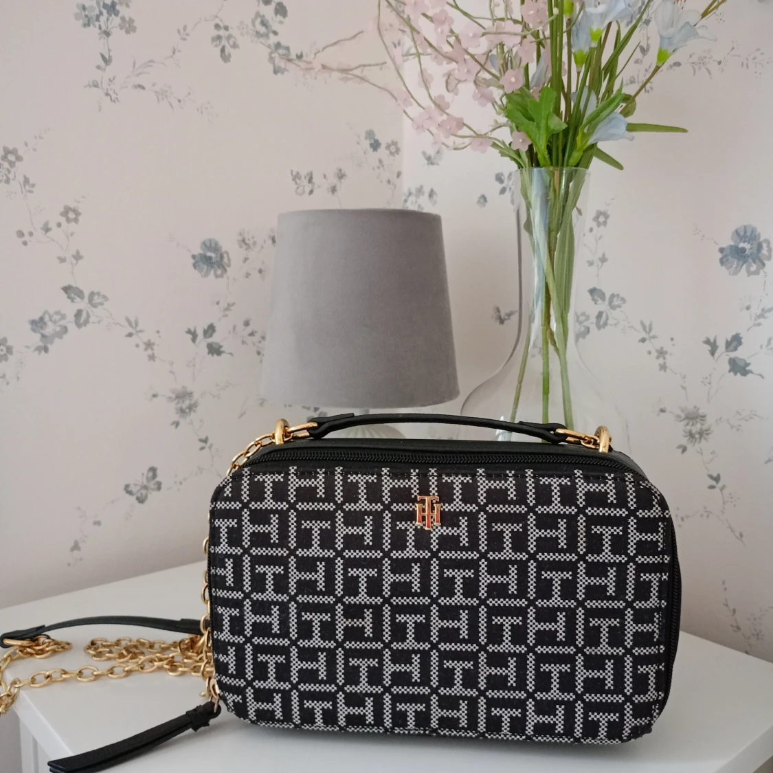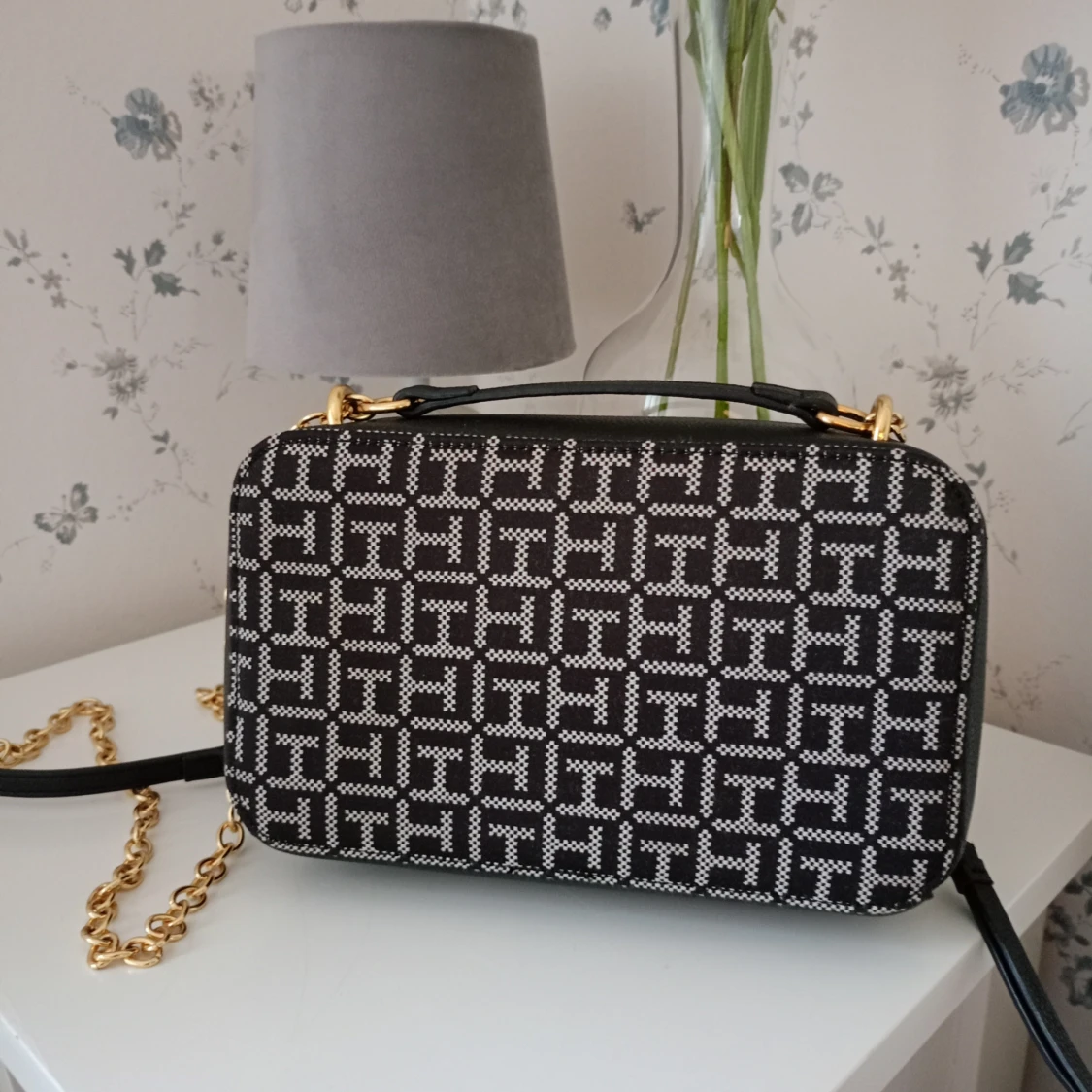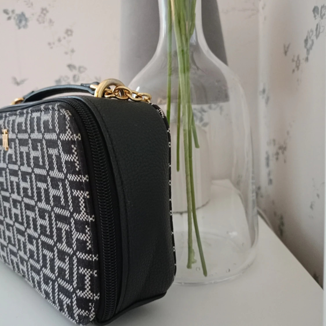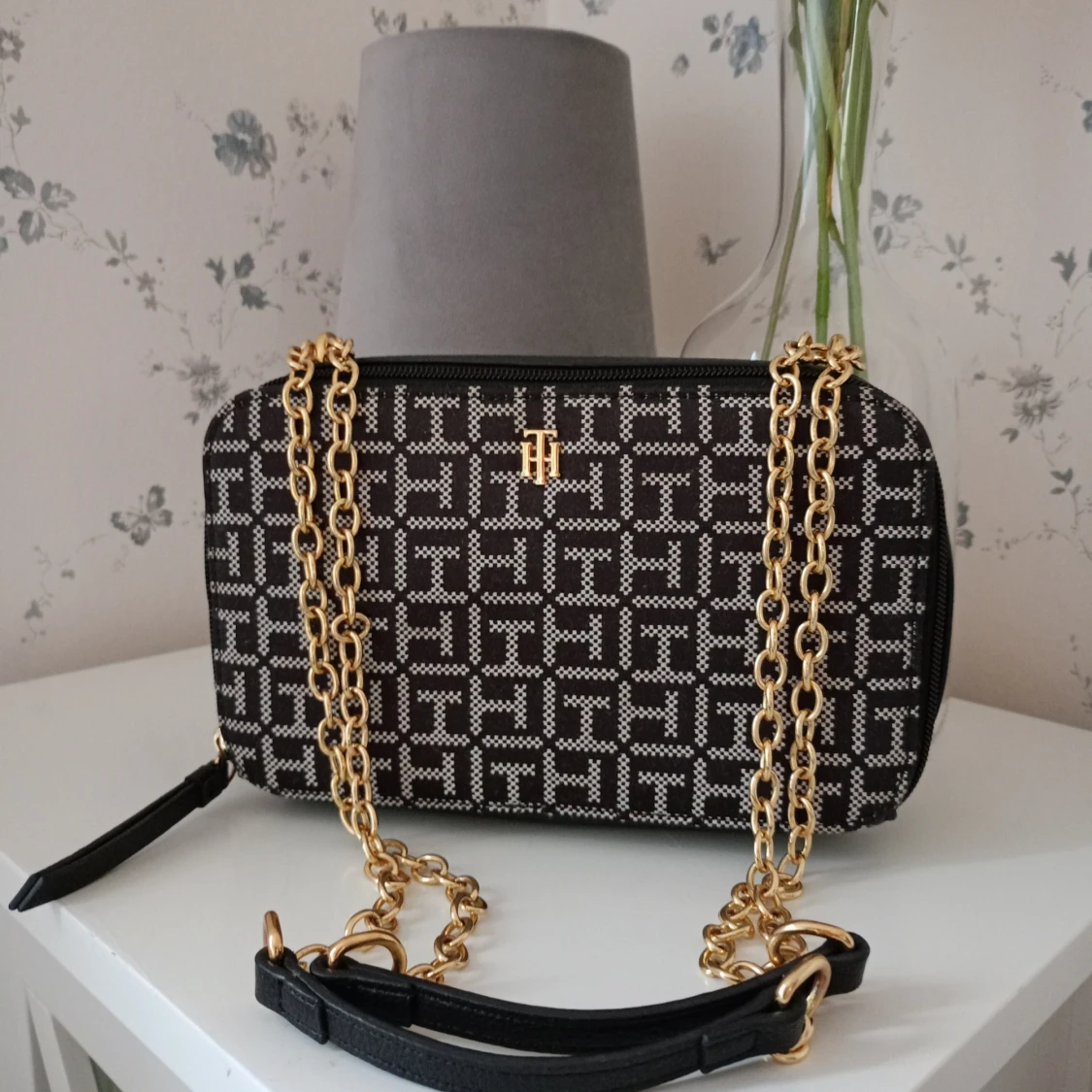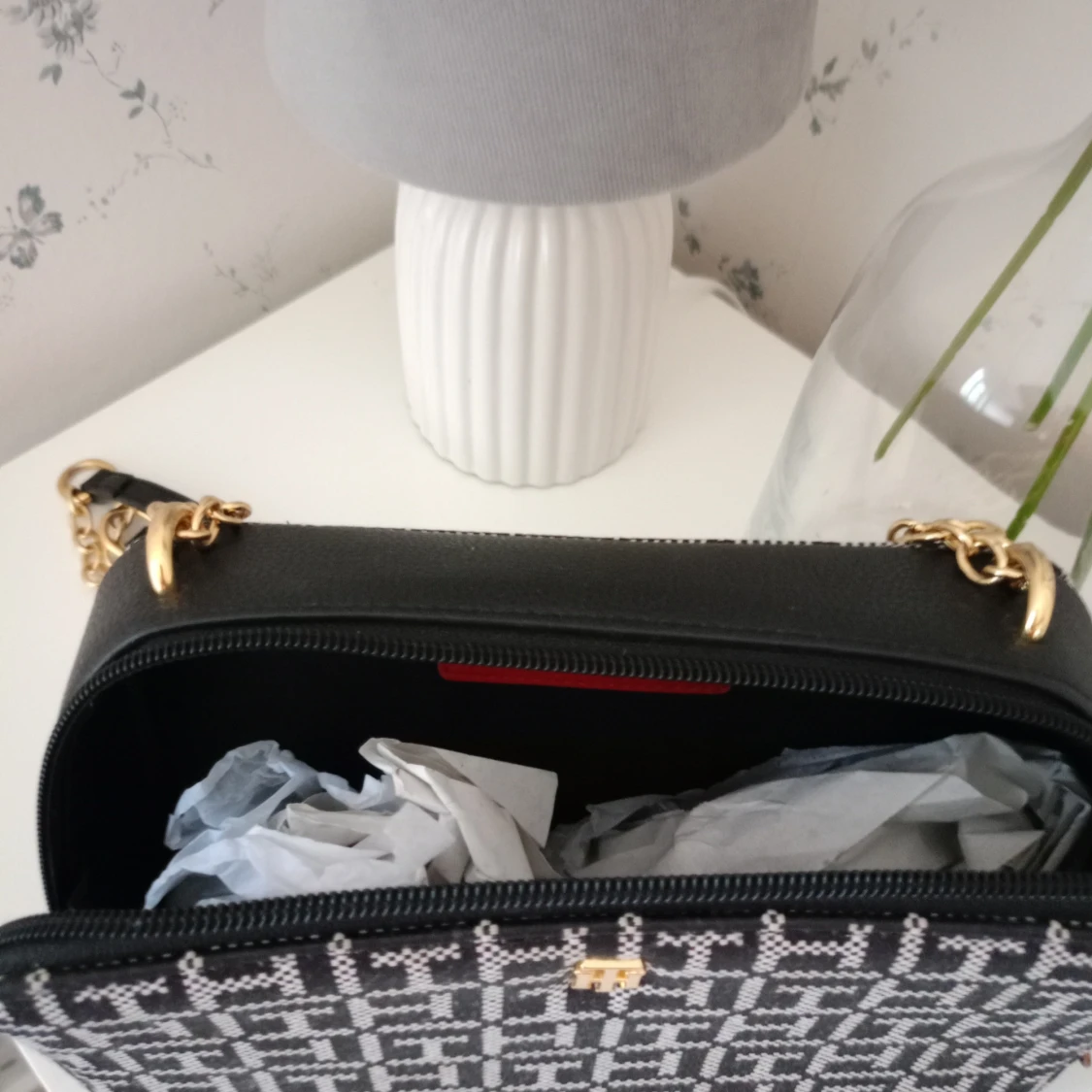 Snygg axelväska i svart och vitt med ett geometriskt mönster. Väskan har guldfärgade kedjedetaljer och en dragkedja för säker förvaring. Perfekt för att ge din outfit en elegant touch.