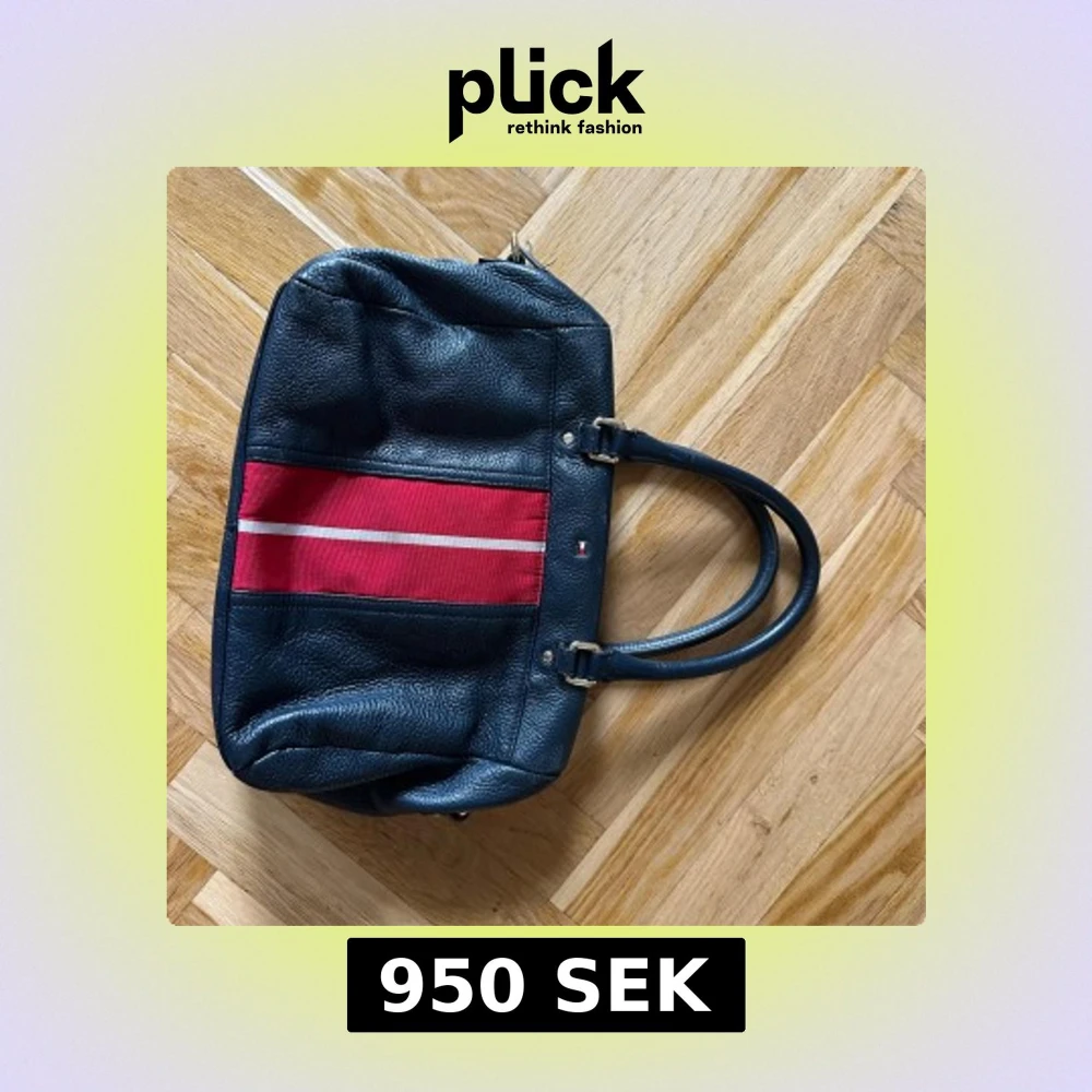 Snygg marinblå handväska från Tommy Hilfiger i skinn med röda och vita ränder framtill. Väskan har dubbla handtag och klassisk TH-logga på framsidan. Perfekt storlek för att få plats med allt du behöver och ger en sportig men stilren vibe.