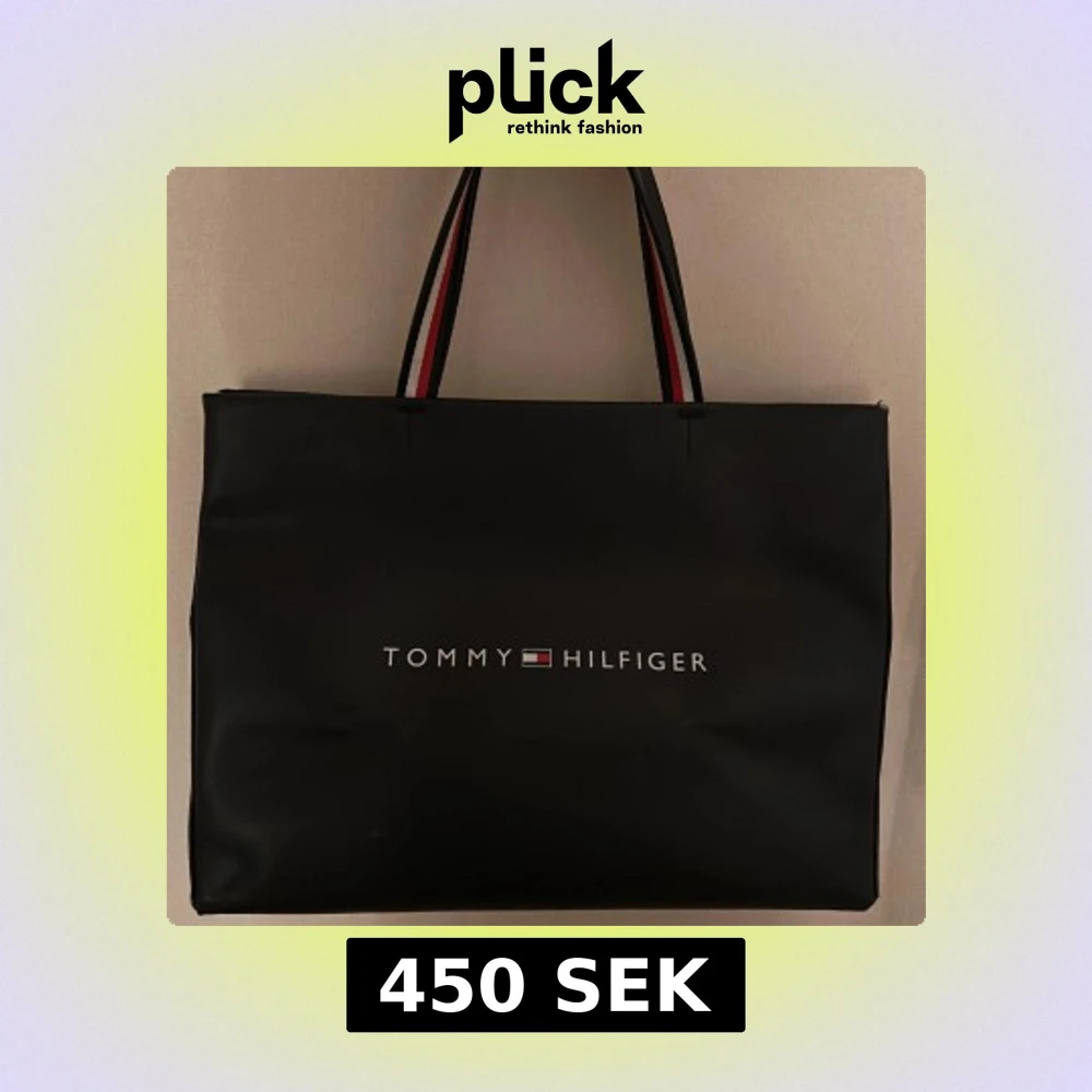 Stilren svart handväska från Tommy Hilfiger med klassisk logga framtill. Väskan har rejäla handtag med röd och vit detalj på insidan. Rymmer mycket och är perfekt för dig som vill ha en snygg och praktisk väska till vardagen. köpt för längesedan och därför finns den inte kvar nypris:1199. Använd några gånger men inga tecken på användning eller slitage.