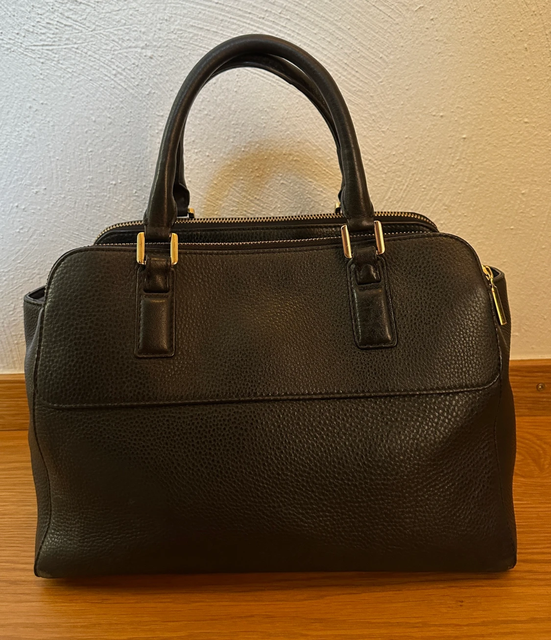 Väskan är i fint skick förutom lite fläckar på insidan, har försökt tvätta bort de men har inte lyckats. Den har många olika fack och är rymlig. Höjd: 24 cm Bredd: 32,5 cm Djup: 16 cm Handremmar: 12 cm