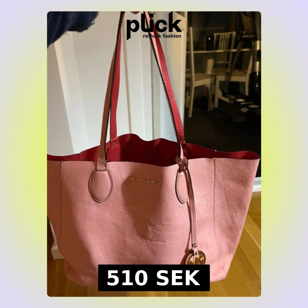 Stor och rymlig shoppingväska från Michael Kors i ljusrosa skinn med röda inslag på insidan och handtag. Väskan har guldfärgad MK-logga och detaljer, samt mjuk struktur. Perfekt för dig som vill ha plats för allt och samtidigt se stylish ut.