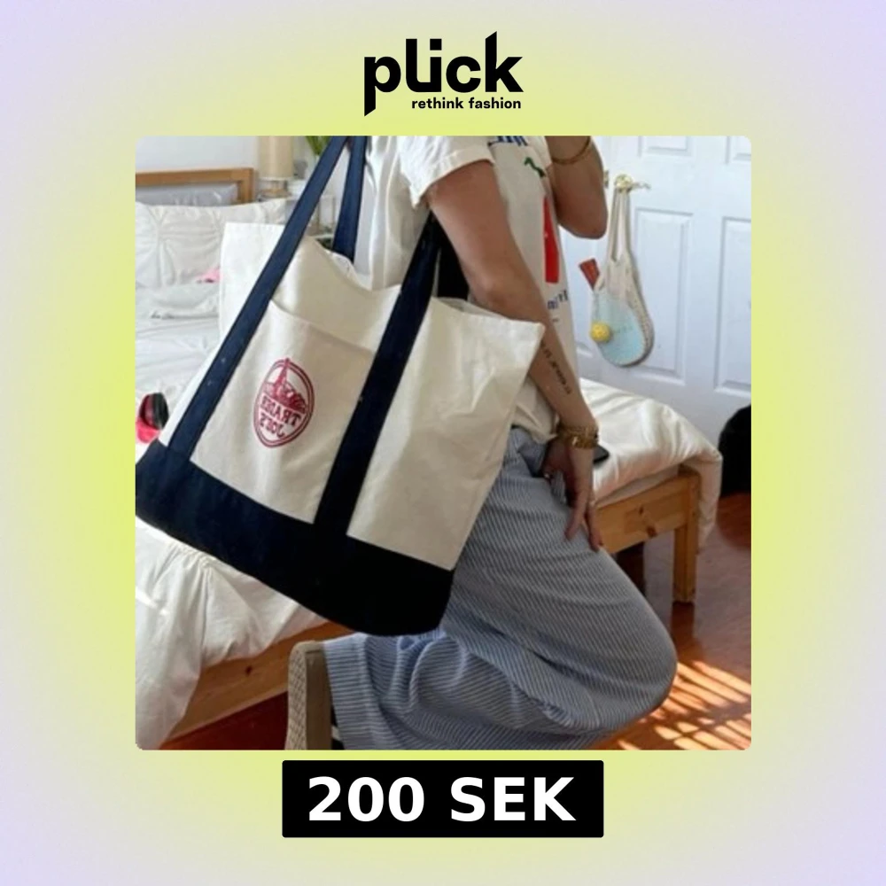 Stor och rymlig shoppingväska från Trader Joe’s med långa axelband och praktisk ytterficka. Köpt i Los Angeles, har en liten blå fläck på baksidan redan vid inköp. Perfekt för skola eller stan💙🤍