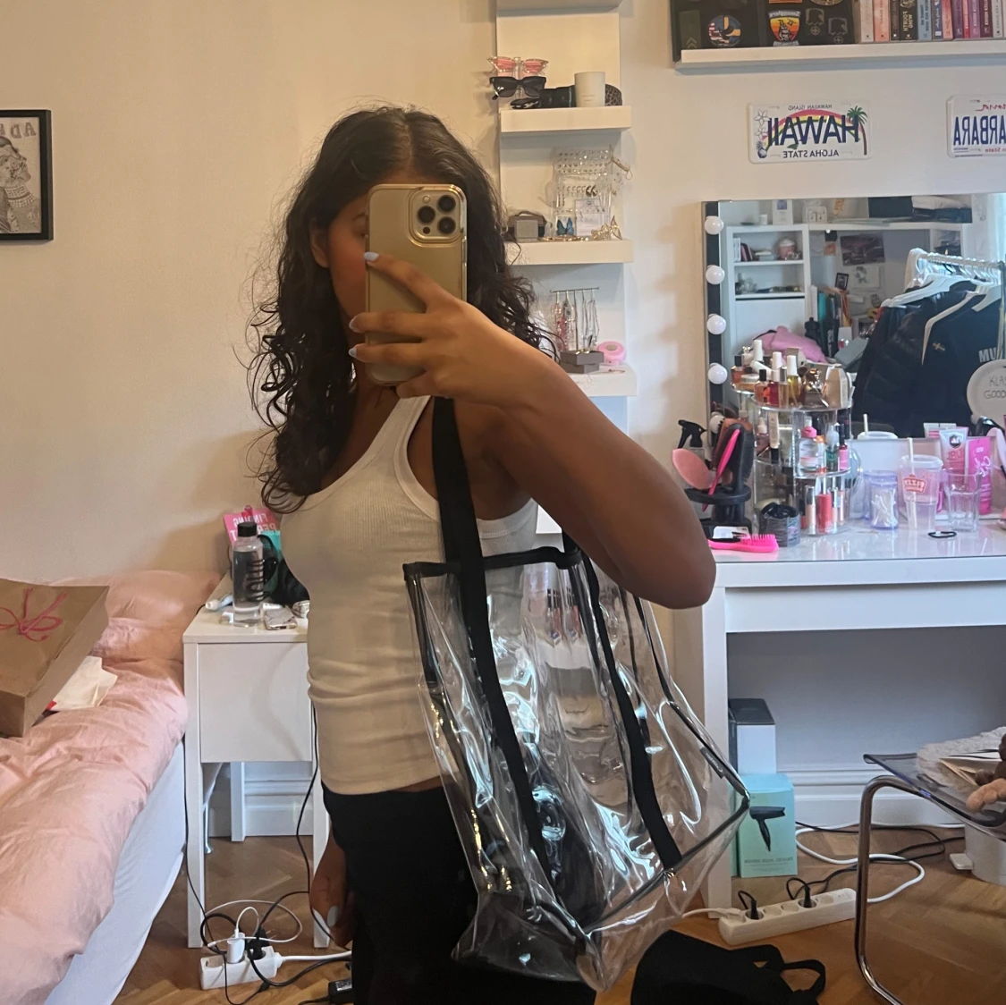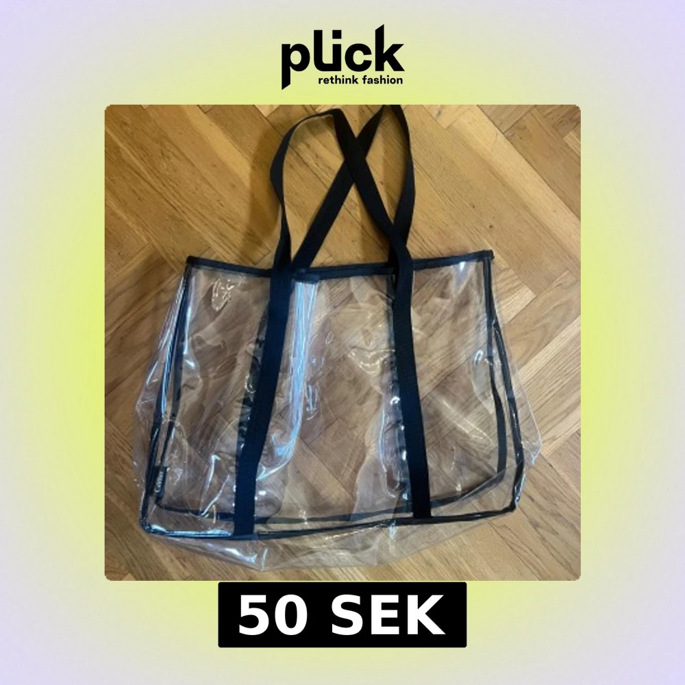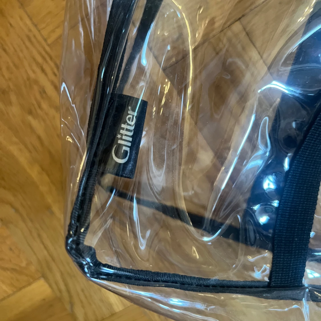 Stor och rymlig transparent shoppingväska från Glitter med svarta handtag och kanter. Perfekt för att visa upp dina grejer och lätt att matcha med olika outfits. Tillverkad i syntetmaterial med stilren, fyrkantig form och långa axelband. Aldrig använd!!!