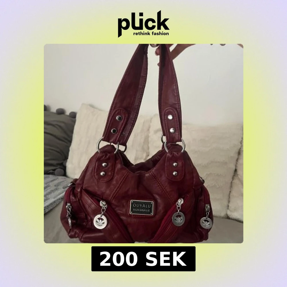 Säljer en vinröd axelväska från OUYALU med flera dragkedjor och silvriga detaljer. Väskan har både korta och lång justerbar rem, samt dekorativa hängsmycken. Perfekt för dig som vill ha en snygg och praktisk accessoar.