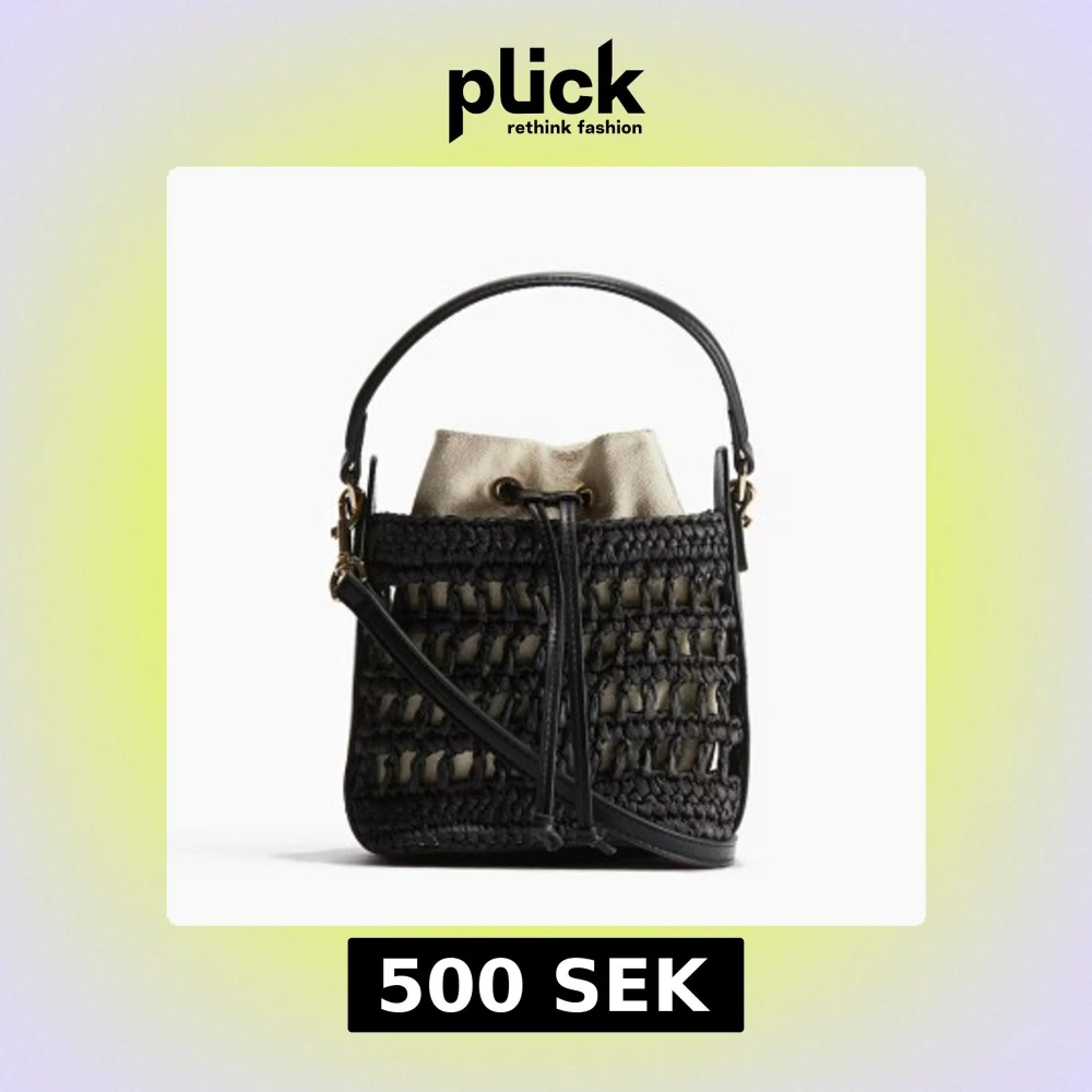 Trendig handväska i svart flätad syntet med beige innerpåse i tyg och dragsko. Väskan har både handtag och axelrem i svart, samt snygga guldfärgade metalldetaljer. Perfekt accessoar för att lyfta din outfit. I ny kollektion från H&M. Slutsåld och efterfrågad