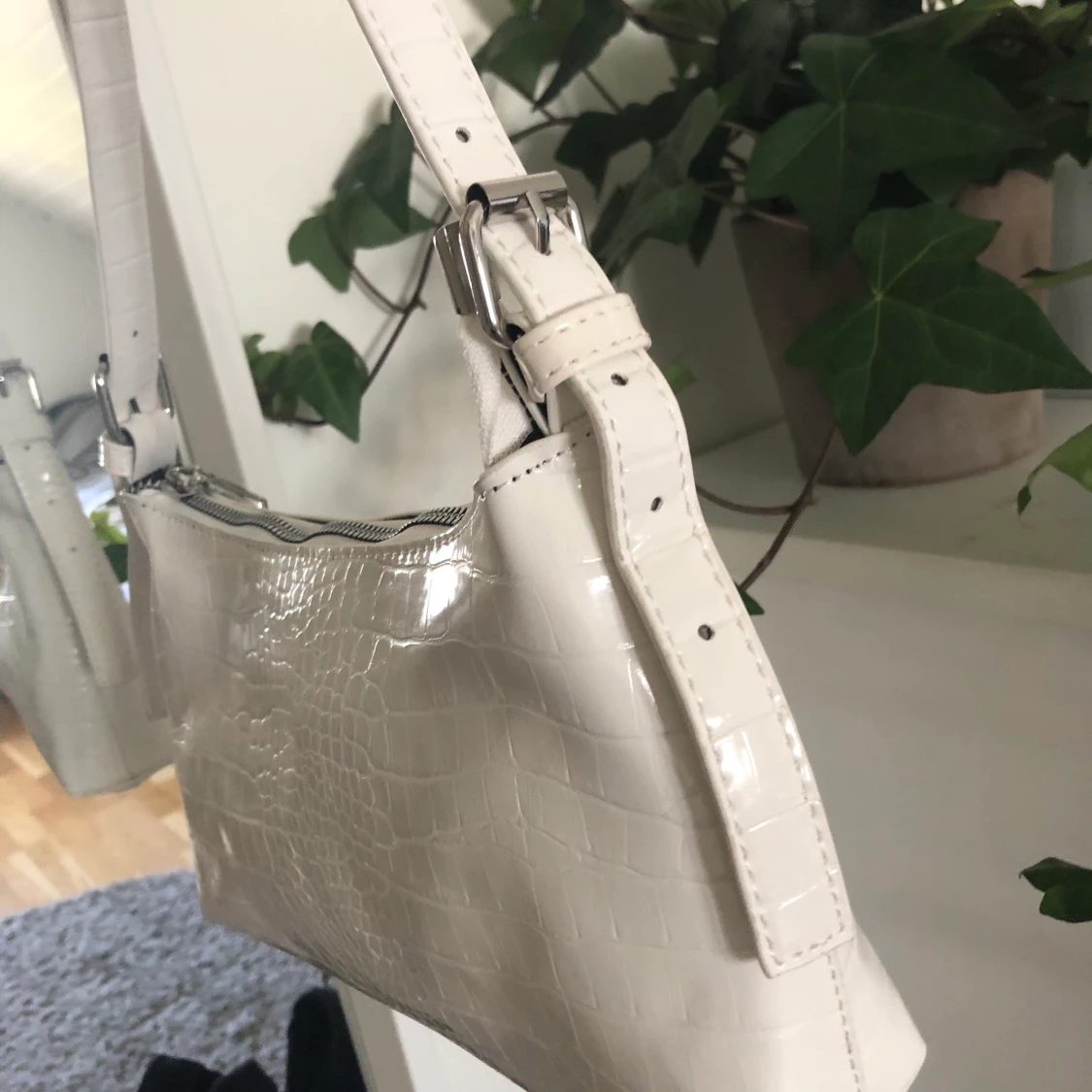 Vit väska med krokodilmönster. Väskan är helt ny, aldrig använd. Säljer pga har redan en liknande. Väskan har justerbara band. Passar perfekt att ha under armen. Ca 25cm på lång.