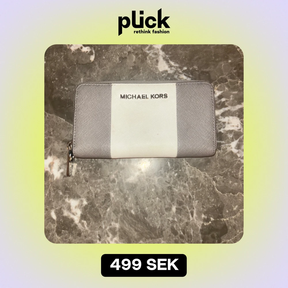 Snygg och stilren plånbok från Michael Kors i grått och vitt. Den har en praktisk dragkedja och flera fack för kort och kontanter. Perfekt för både vardag och fest! 👜✨