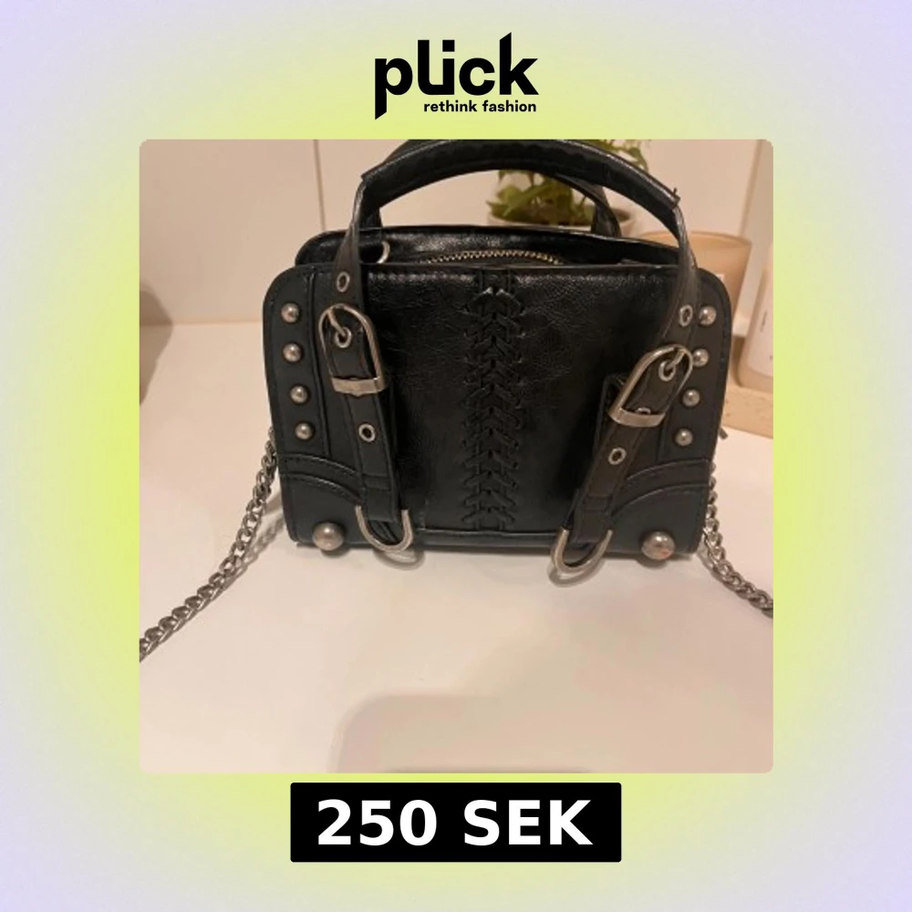 Svart handväska med coola detaljer. Har använt många gånger och tecken på användning syns, metallen har blivit lite rustigt men annars har väskan tagits bra hand om. Kedjan har knyts ihop (bild 3)och då kan den se kortare ut om man ska ha crossbody. Skriv om du har funderingar💕💕
