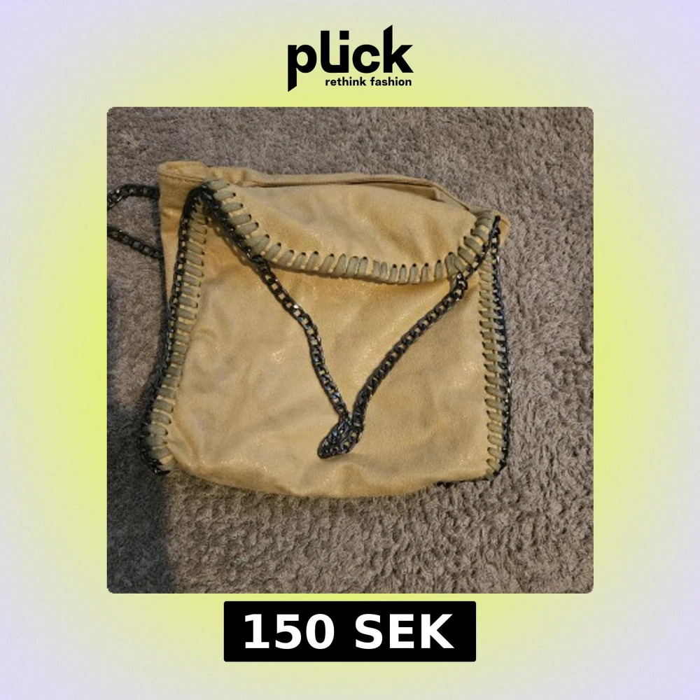 Snygg mellan-liten ljusgul väska i mockaimitation med glittrig finish och coola kedjor längs kanterna. Många bra fack inuti. Längd:ca 22, höjd:ca 23