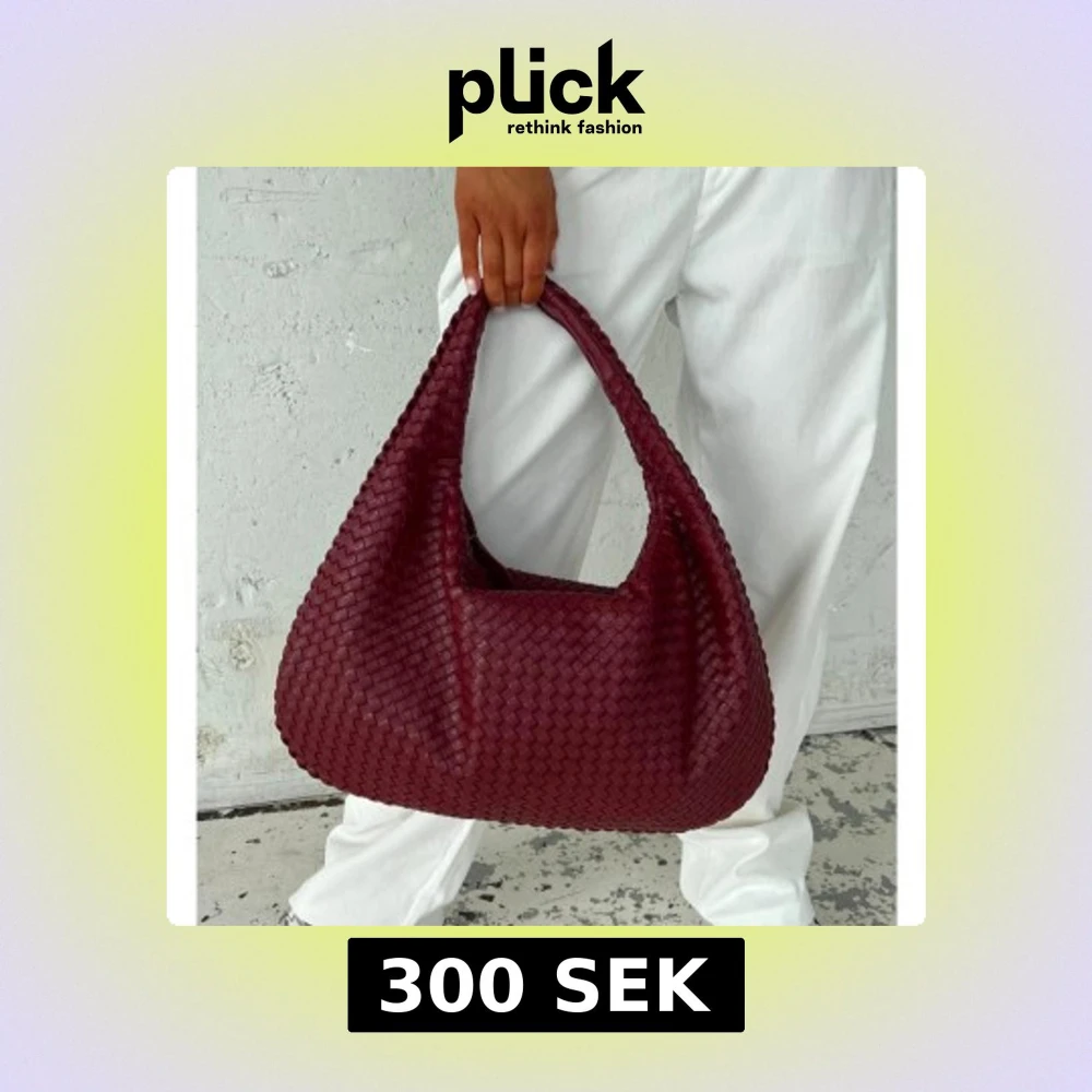 Helt ny! Säljer en stor och mjuk axelväska i vinrött skinn med flätad design. Väskan har en rundad, slouchy form och bred axelrem som gör den enkel att bära. Perfekt för dig som gillar att ha med dig mycket och vill sticka ut med en snygg accessoar. Får plats med en 13 tum dator