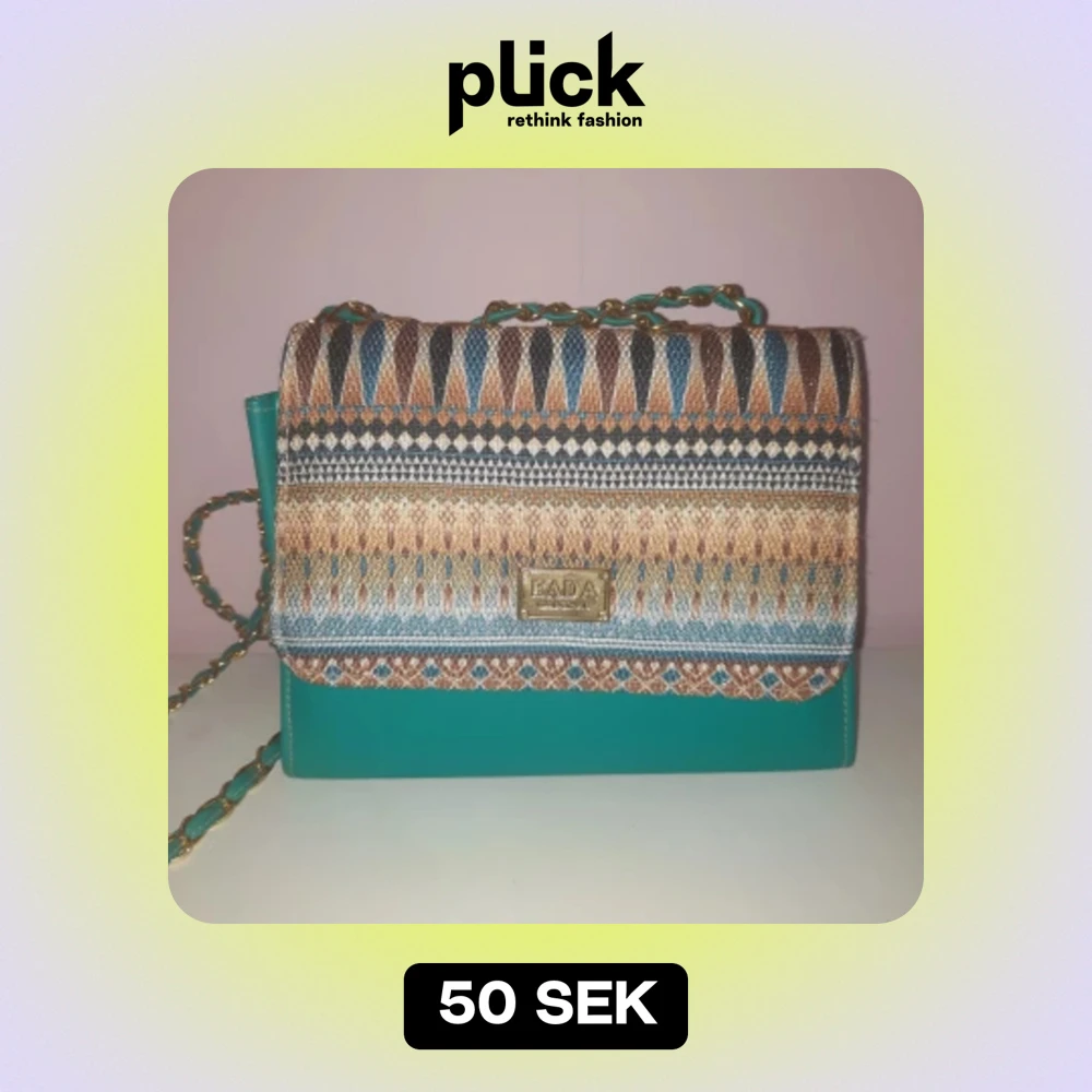 Blågrön handväska med guldfärgade detaljer köpt i Thailand. Nästan helt oanvänd och förutom en liten fläck på baksidan så är den helt oskadad och ren. Får plats med mycket. Ungefär 15 cm hög och 20 cm bred. Går att använda som handväska eller över axeln.