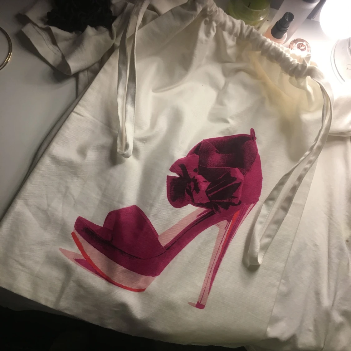 Vit tygkasse/jumpapåse med skotryck på, aldrig använd inte riktigt min stil, swish går bra köpare står för frakt