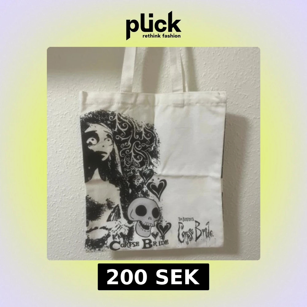 Säljer en cool vit tygväska med tryck från Tim Burton's Corpse Bride. 🩷 den ser likadan ut på båda sidorna