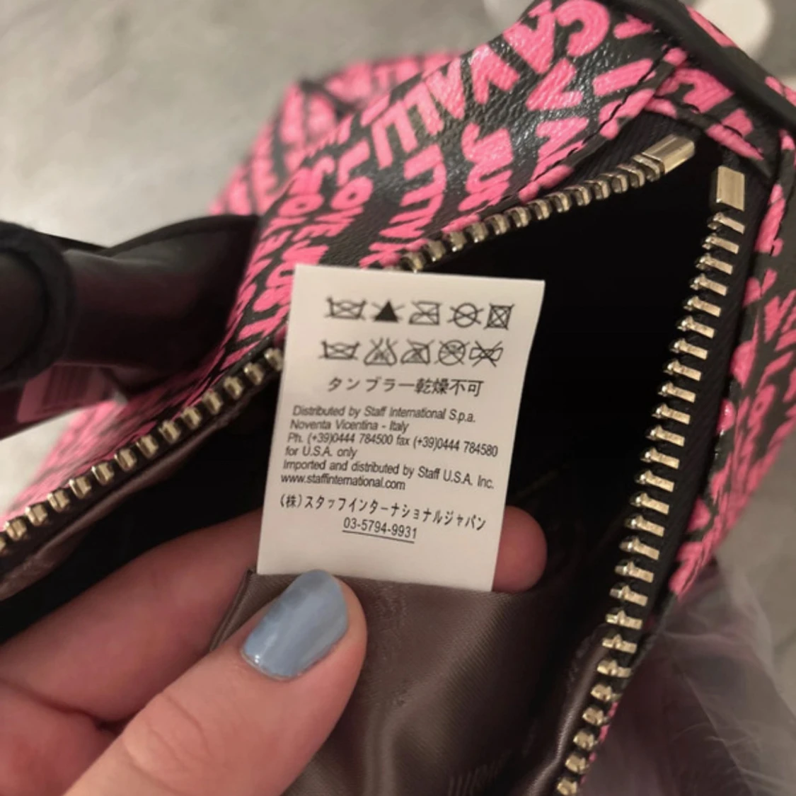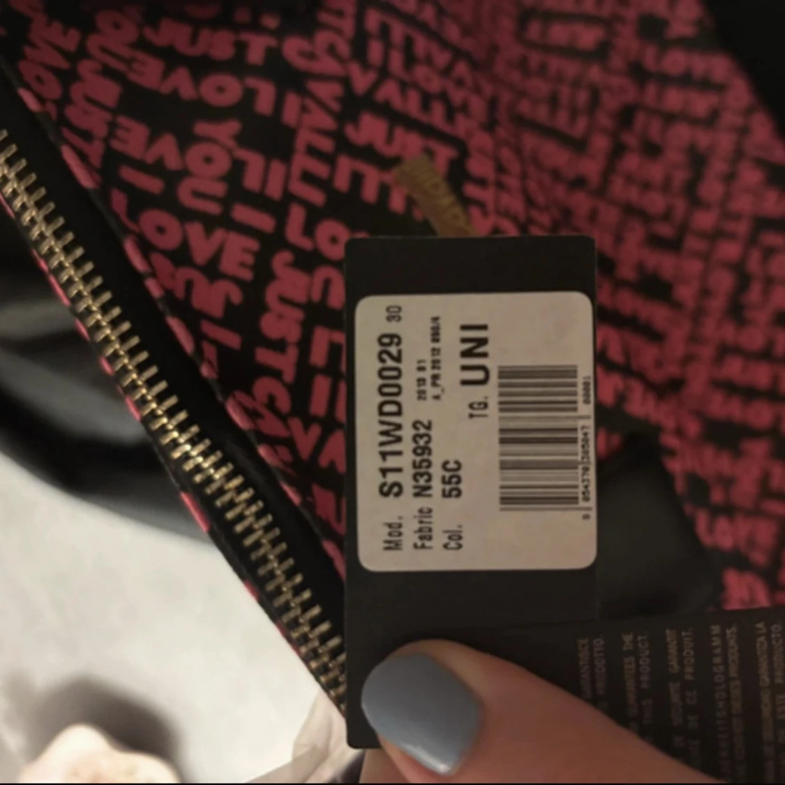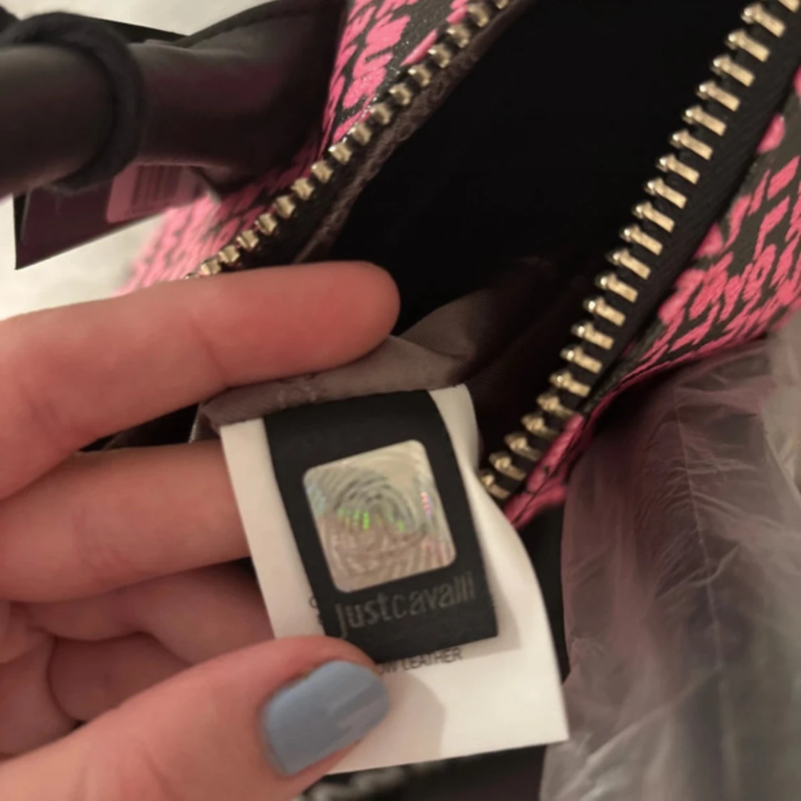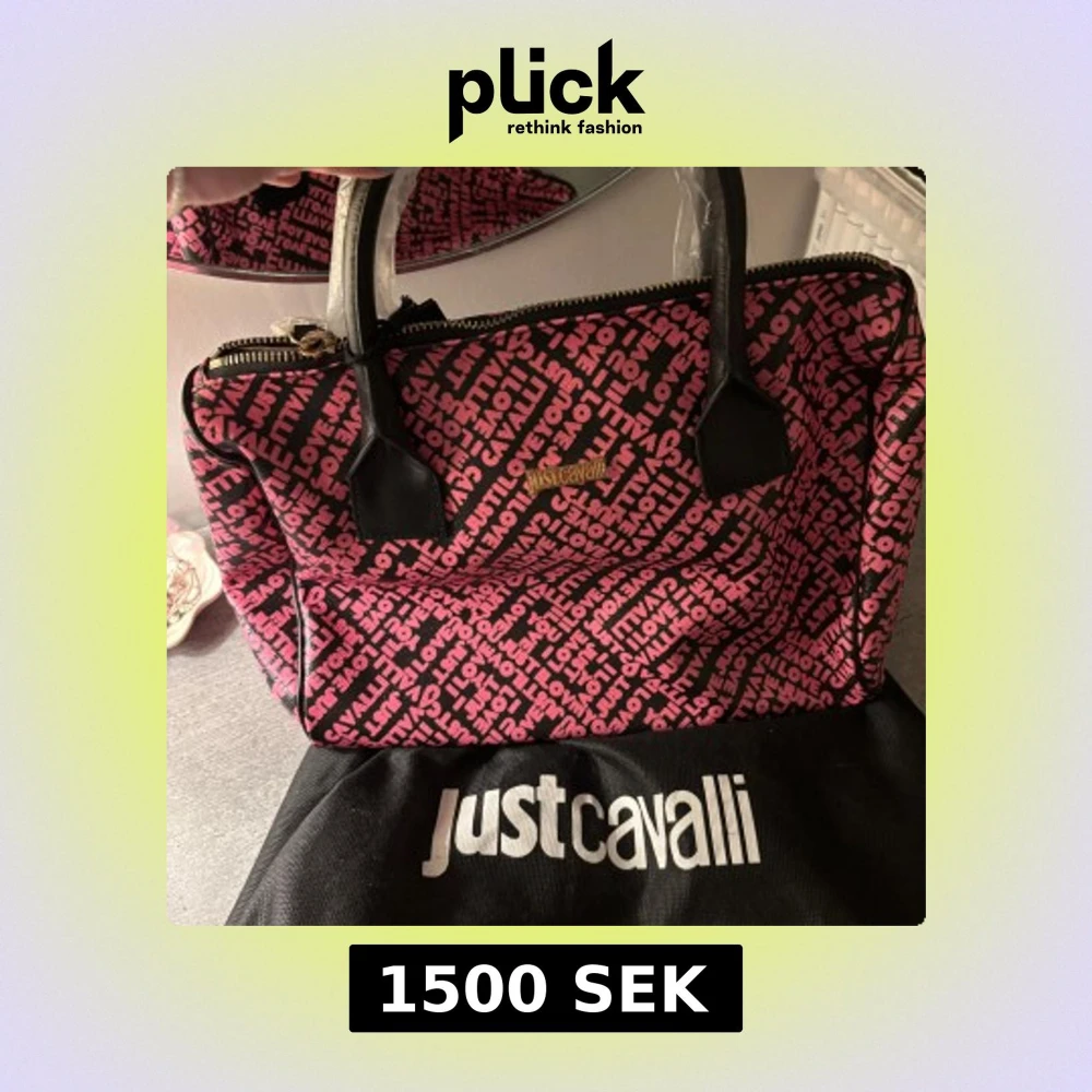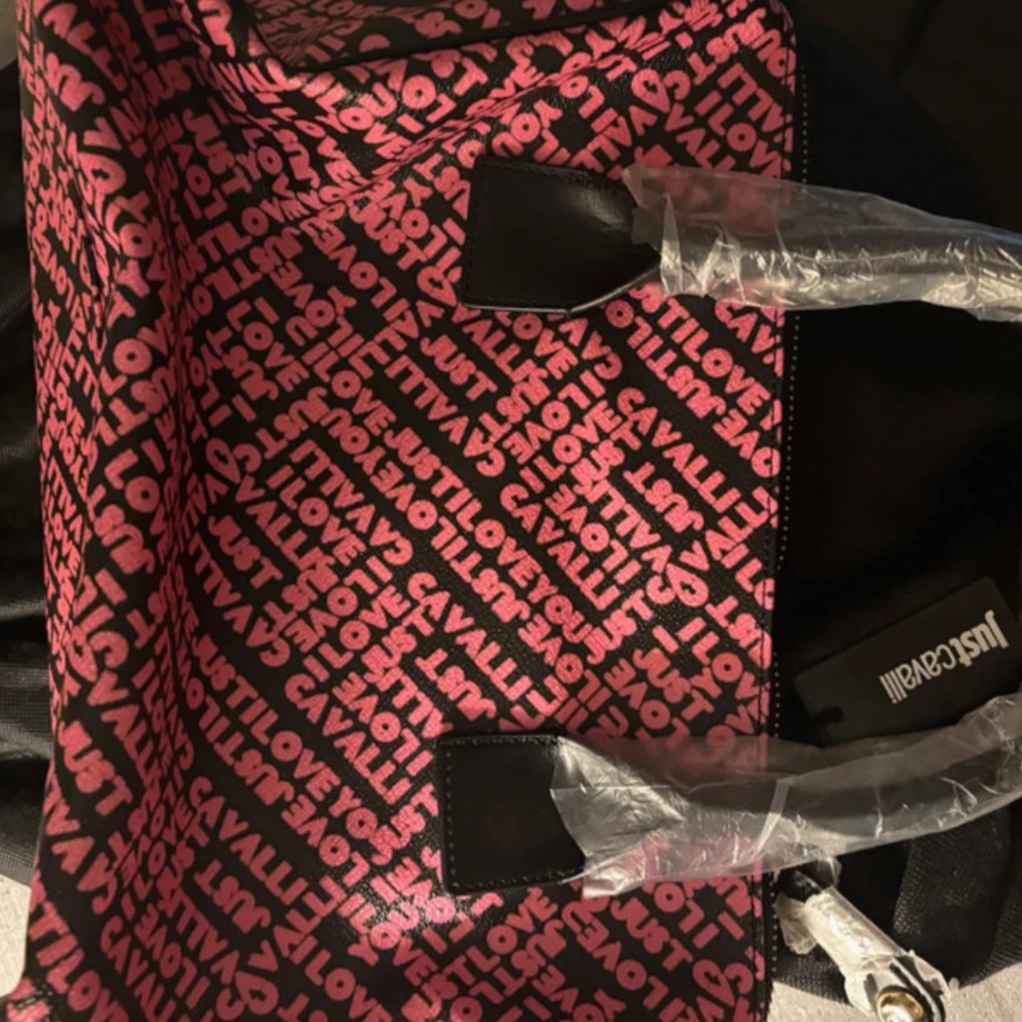 Säljer en snygg handväska från Just Cavalli med rosa textprint över svart bakgrund. Väskan har svarta handtag i skinn, guldfärgad logga och dragkedja upptill. Kommer med original dustbag. Säljer den också på Vinted‼️