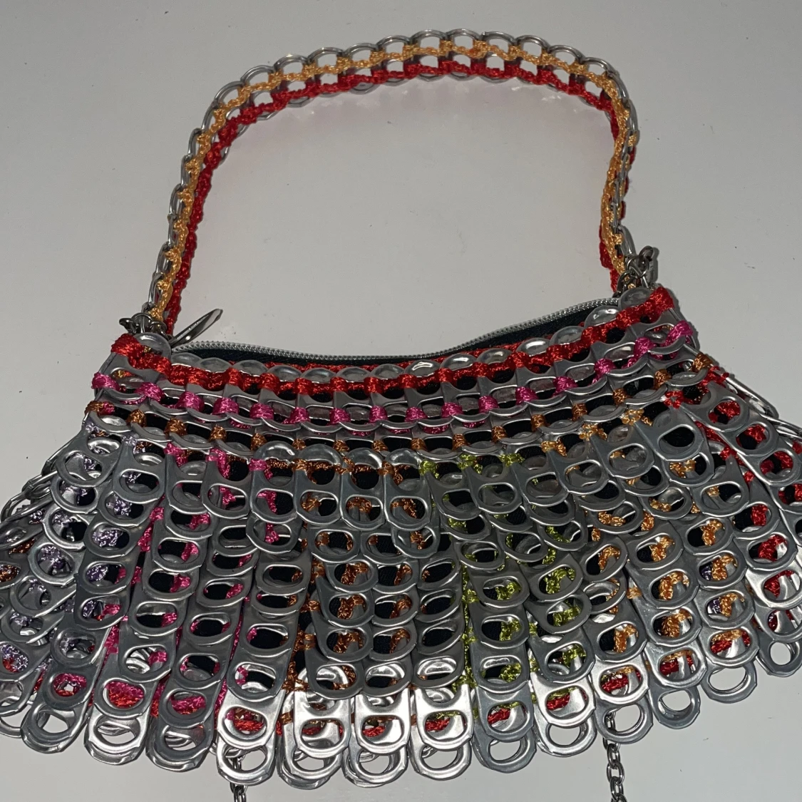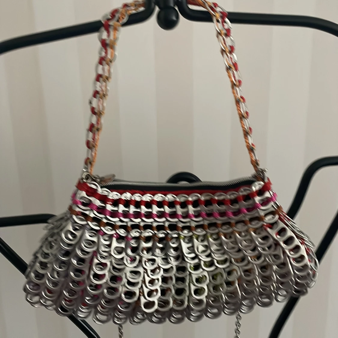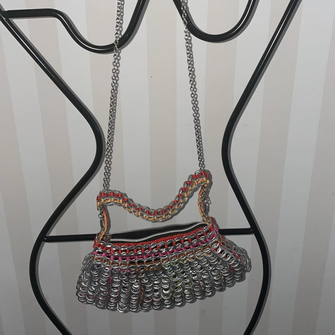 Säljer en unik handväska/axelrem gjord av återvunna metallringar / läsköppnare med färgglada detaljer i rött, rosa och orange.Mått 25*15 cm. Väskan har en dragkedja upptill och en kedja som axelrem. Perfekt för dig som vill ha något annorlunda och miljövänligt!