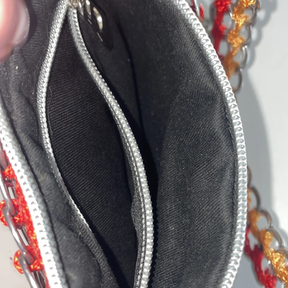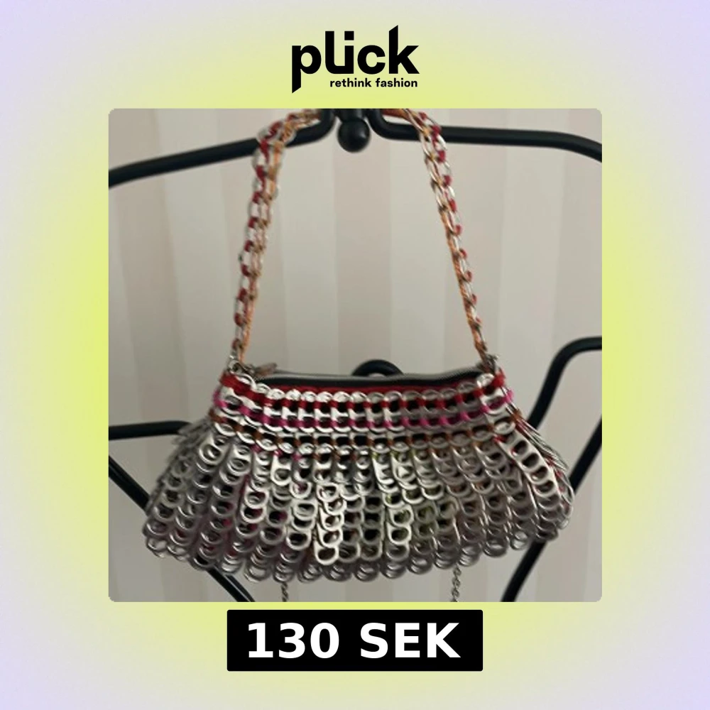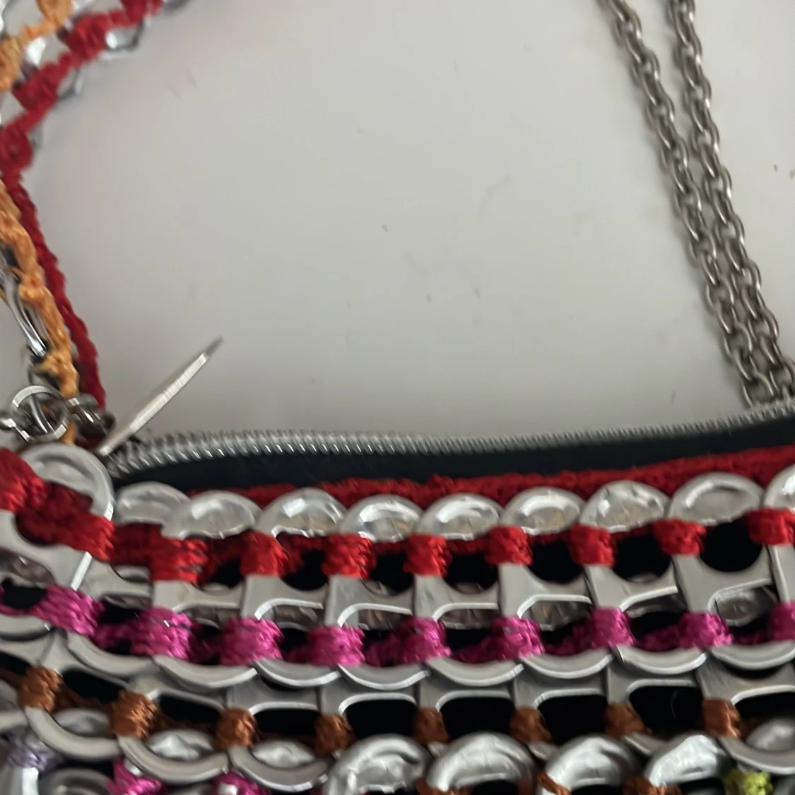 Säljer en unik handväska/axelrem gjord av återvunna metallringar / läsköppnare med färgglada detaljer i rött, rosa och orange.Mått 25*15 cm. Väskan har en dragkedja upptill och en kedja som axelrem. Perfekt för dig som vill ha något annorlunda och miljövänligt!
