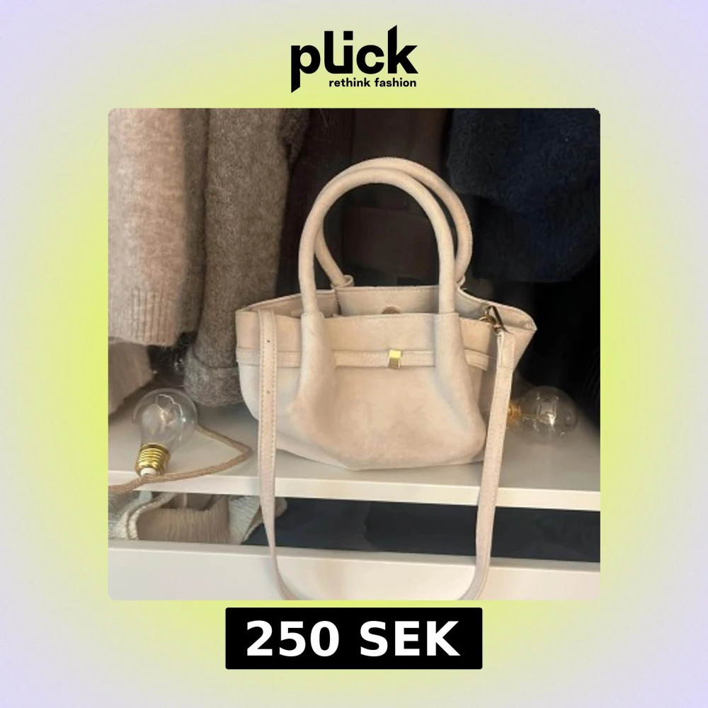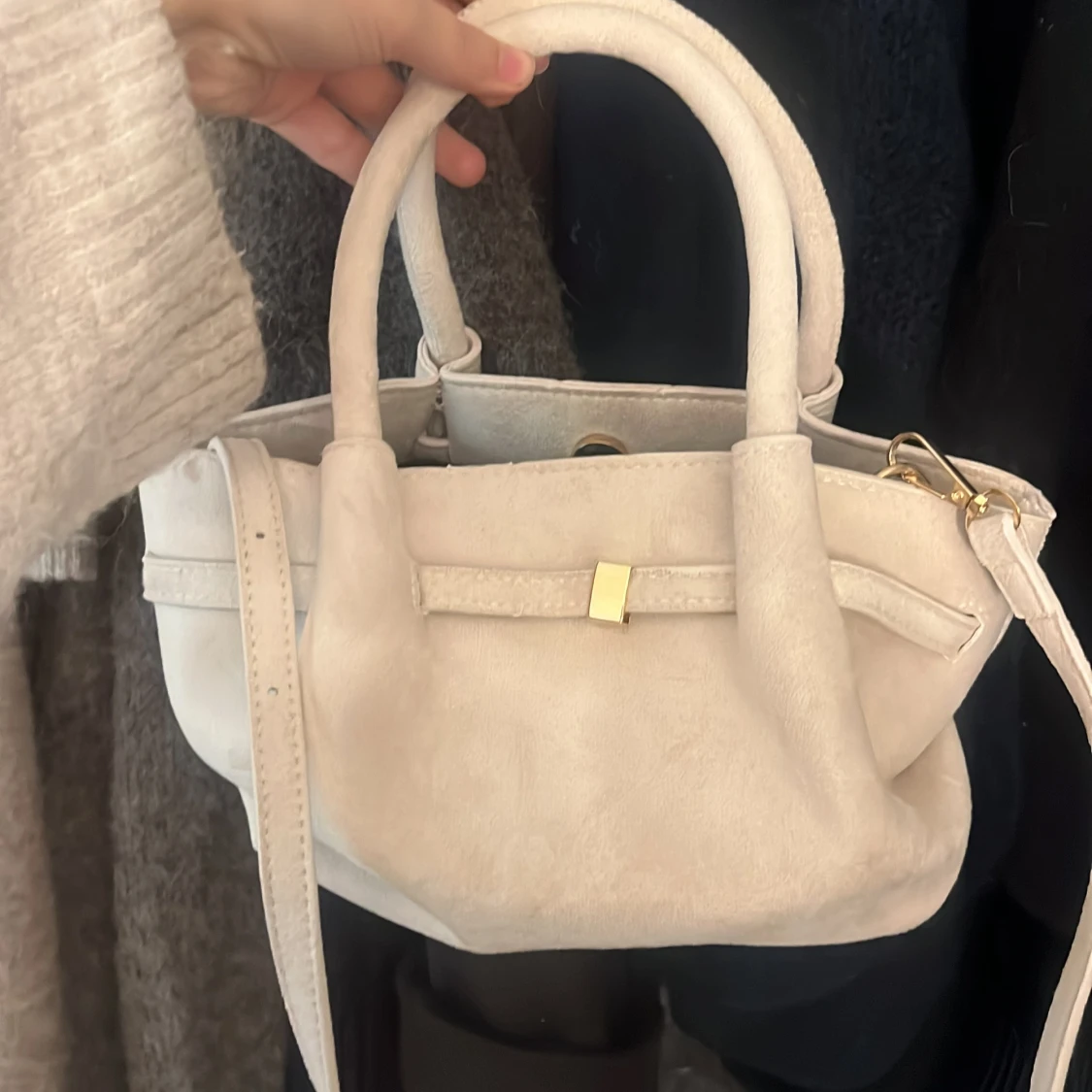 Snygg ljusbeige handväska i mocka-look med både handtag och justerbar axelrem. Väskan har guldfärgade metalldetaljer och en stilren, minimalistisk design. Perfekt storlek för det viktigaste och passar till många outfits.
