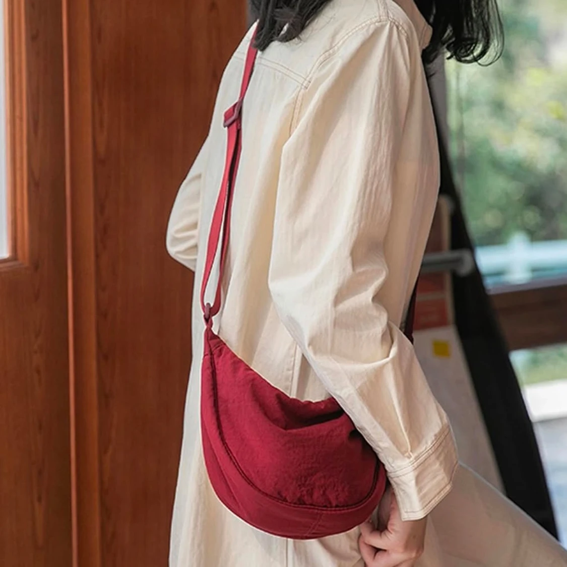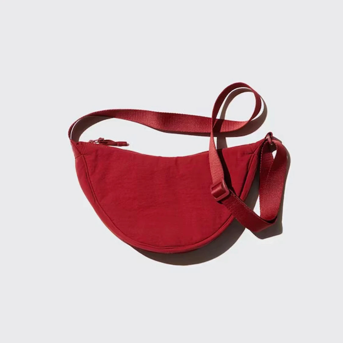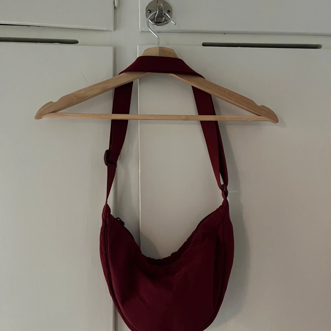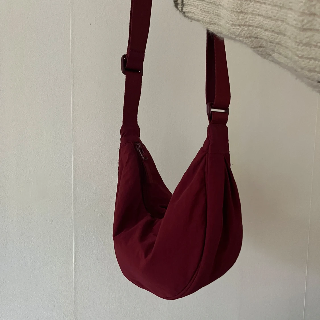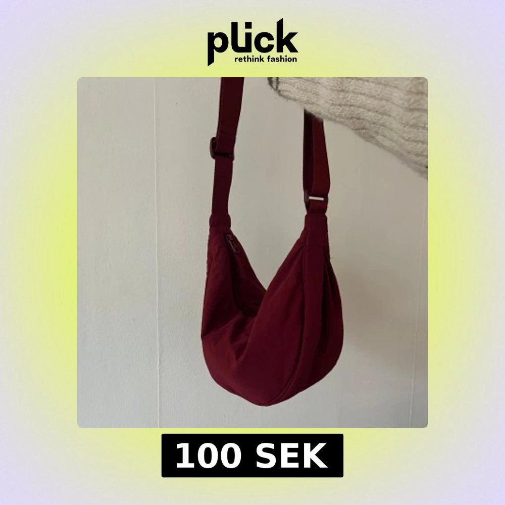 Vinröd praktisk axelväska med justerbar rem och dragkedja.