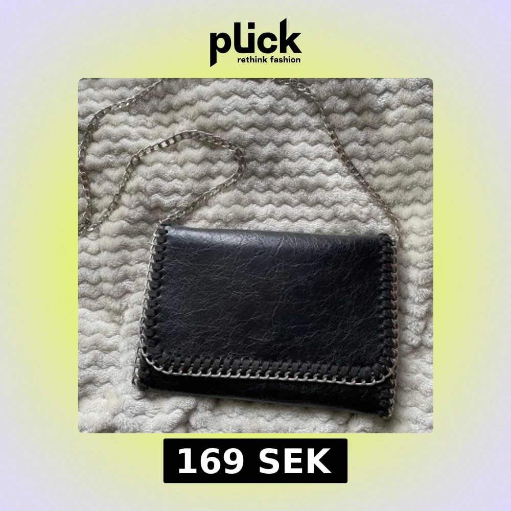 Snygg svart handväska i skinnimitation med silverfärgad kedja som axelrem. Väskan har dekorativa sömmar längs kanterna och ett magnet öppning. Insidan har ett fack med dragkedja för småsaker. Perfekt storlek för det viktigaste. Nypris ca 300💕