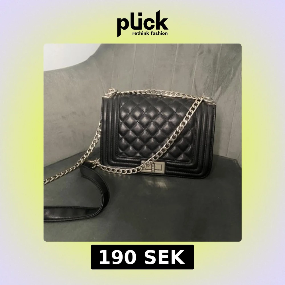 Snygg svart axelväska med quiltad framsida och silverfärgad kedja som axelrem. Väskan har en rektangulär form och ett stilrent metallspänne framtill. Perfekt för dig som gillar klassisk och trendig design. Tror att den är från ur & penn
