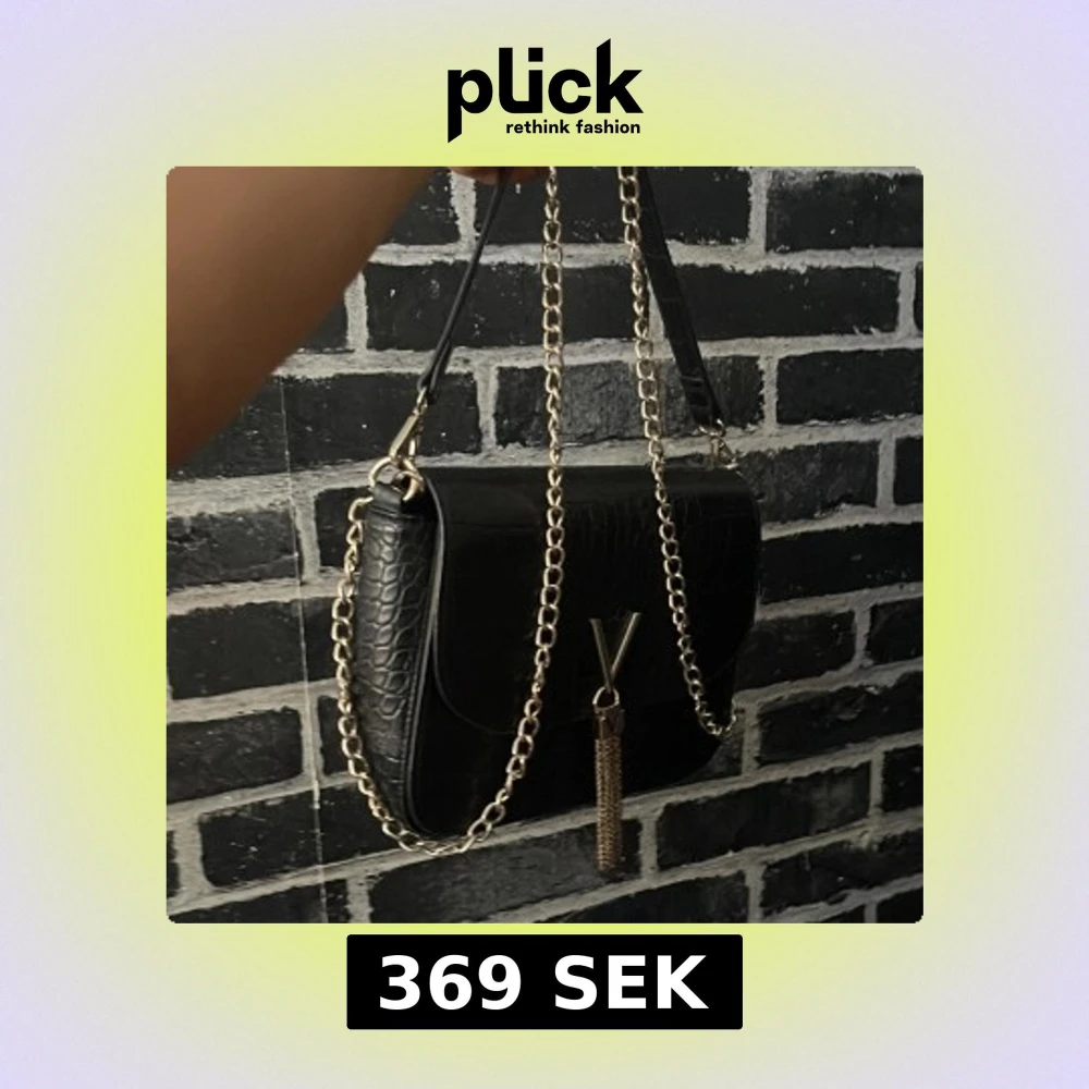 Snygg svart axelväska i croco-mönstrat skinnimitation med guldfärgad kedja och en stor V-detalj framtill. Väskan har en dekorativ tofs i guld och stilren form, perfekt för att lyfta din outfit. Locket stängs med magnet och axelremmen är både kedja och skinn.