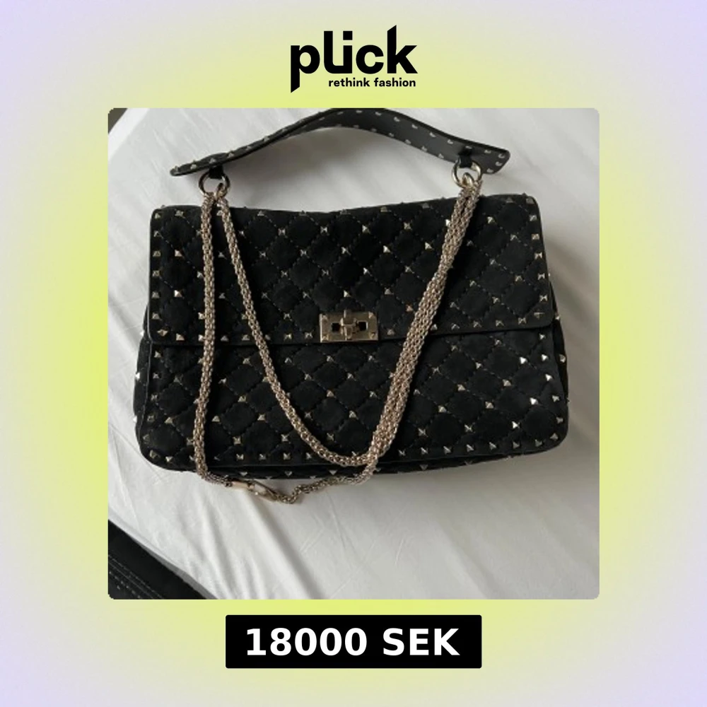 Säljer en svart Valentino väska med coola guldfärgade nitar och kedjerem. Väskan har en snygg låsdetalj framtill och är gjord i mjuk mocka. Perfekt för dig som gillar edgy vibes och vill sticka ut med accessoarerna. Original och kvitto finns.