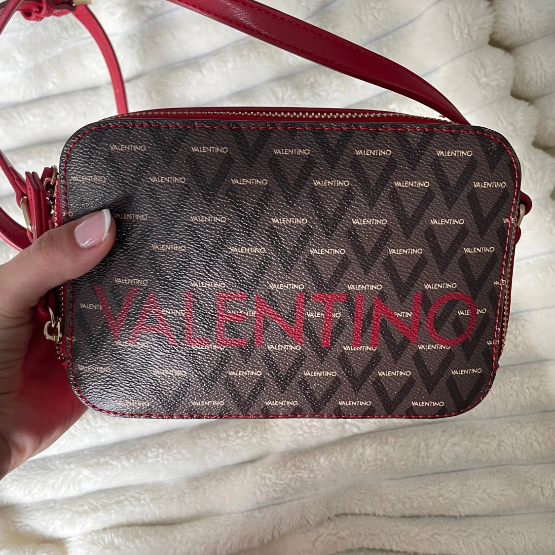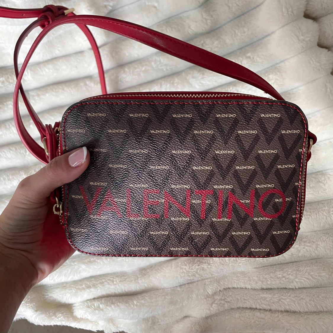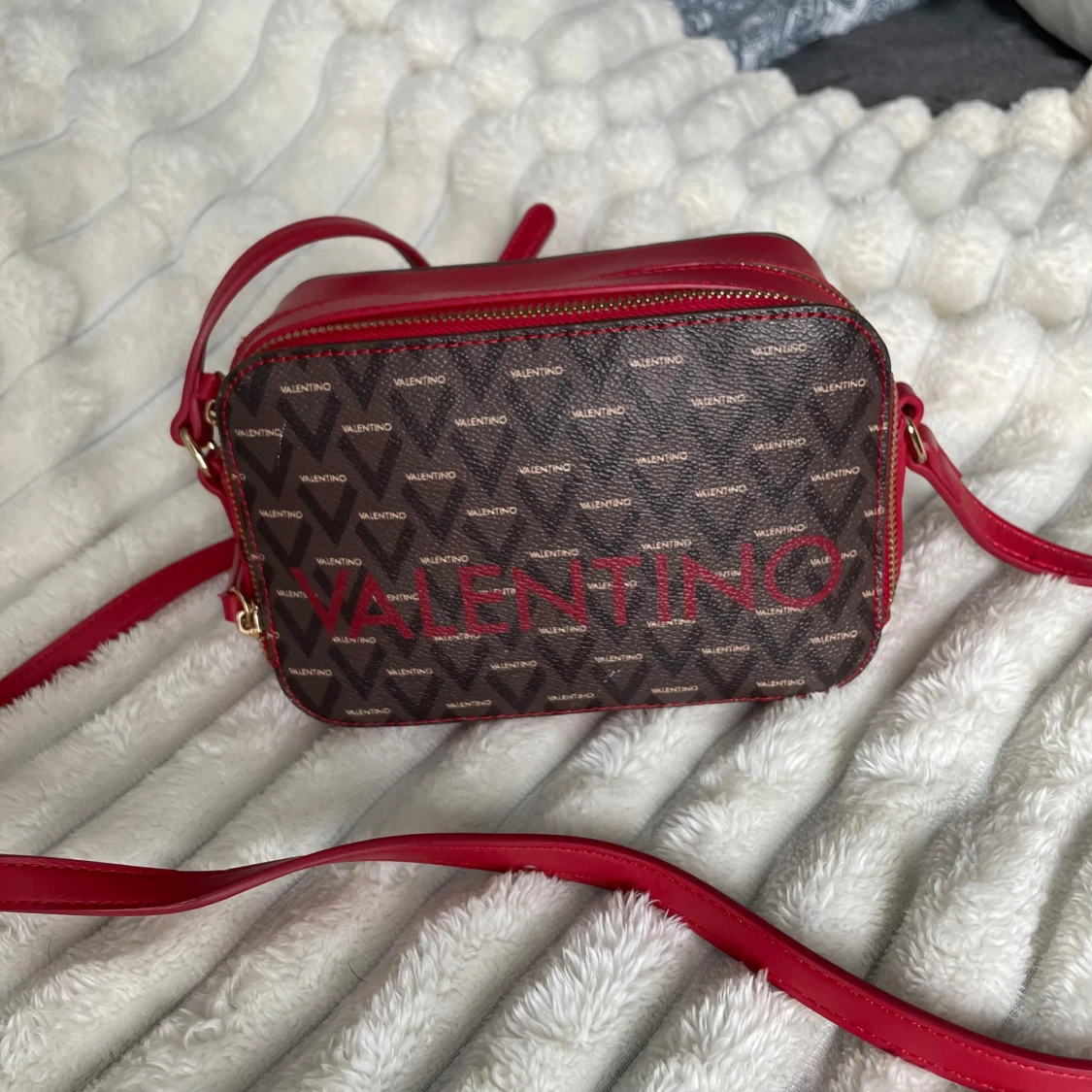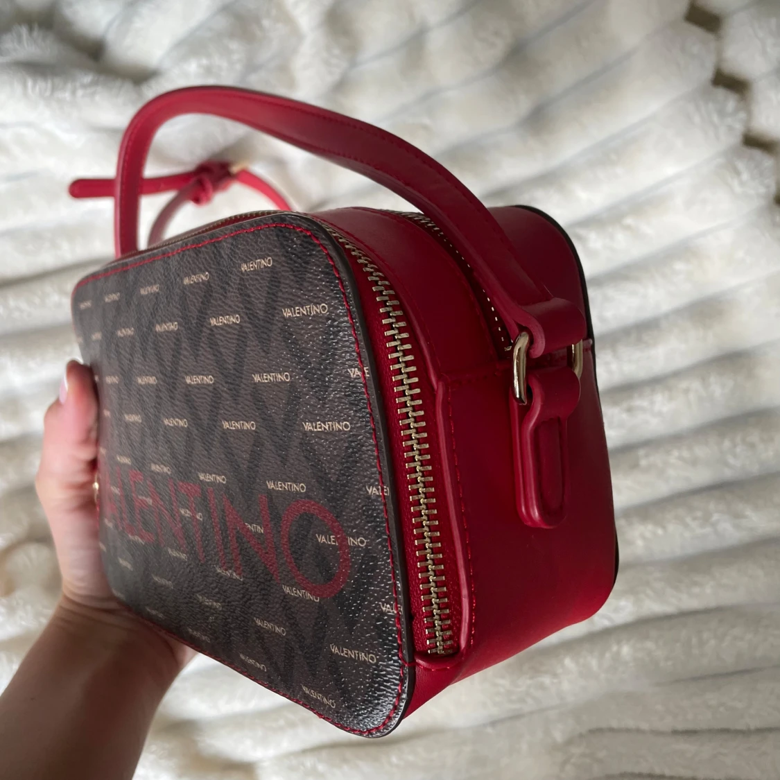 Jättefin valentino väska som används vid ett tillfälle. Alltså splitterny! Färgen i denna modell säljs ej längre. Inköpspris ca. 1000kr. Medföljande påse skickas med! Har förvarats bra och har felfri form. Kommer självklart postas i en kartong!