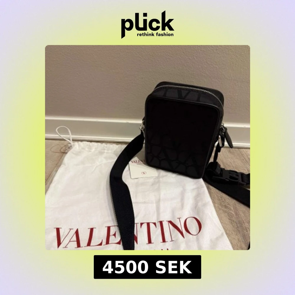 Snygg svart axelväska från Valentino Garavani med diskret mönster och silverfärgad dragkedja. Väskan har justerbar axelrem och praktiskt fack framtill. Perfekt storlek för mobil, plånbok och andra essentials.