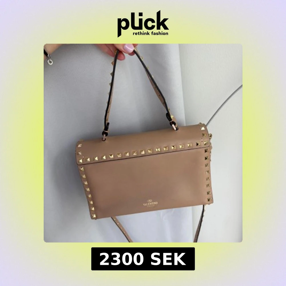 Säljer en beige axelväska från Valentino med ikoniska guldiga nitar runt kanterna och på axelremmen. Väskan är i slätt skinn och har både handtag och lång axelrem. Invändigt finns flera fack och dragkedja. Perfekt för dig som gillar edgy men stilren design.