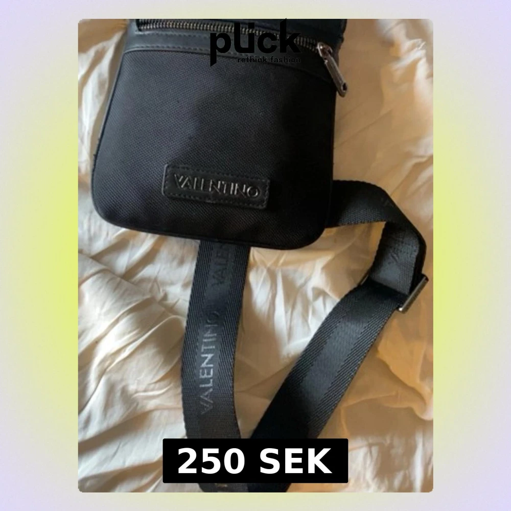 Snygg svart axelväska från Valentino med justerbar rem där loggan är tryckt. Väskan har en stilren design med dragkedja upptill och är tillverkad i slitstark syntet. Perfekt storlek för det viktigaste och passar till en modern streetstil.