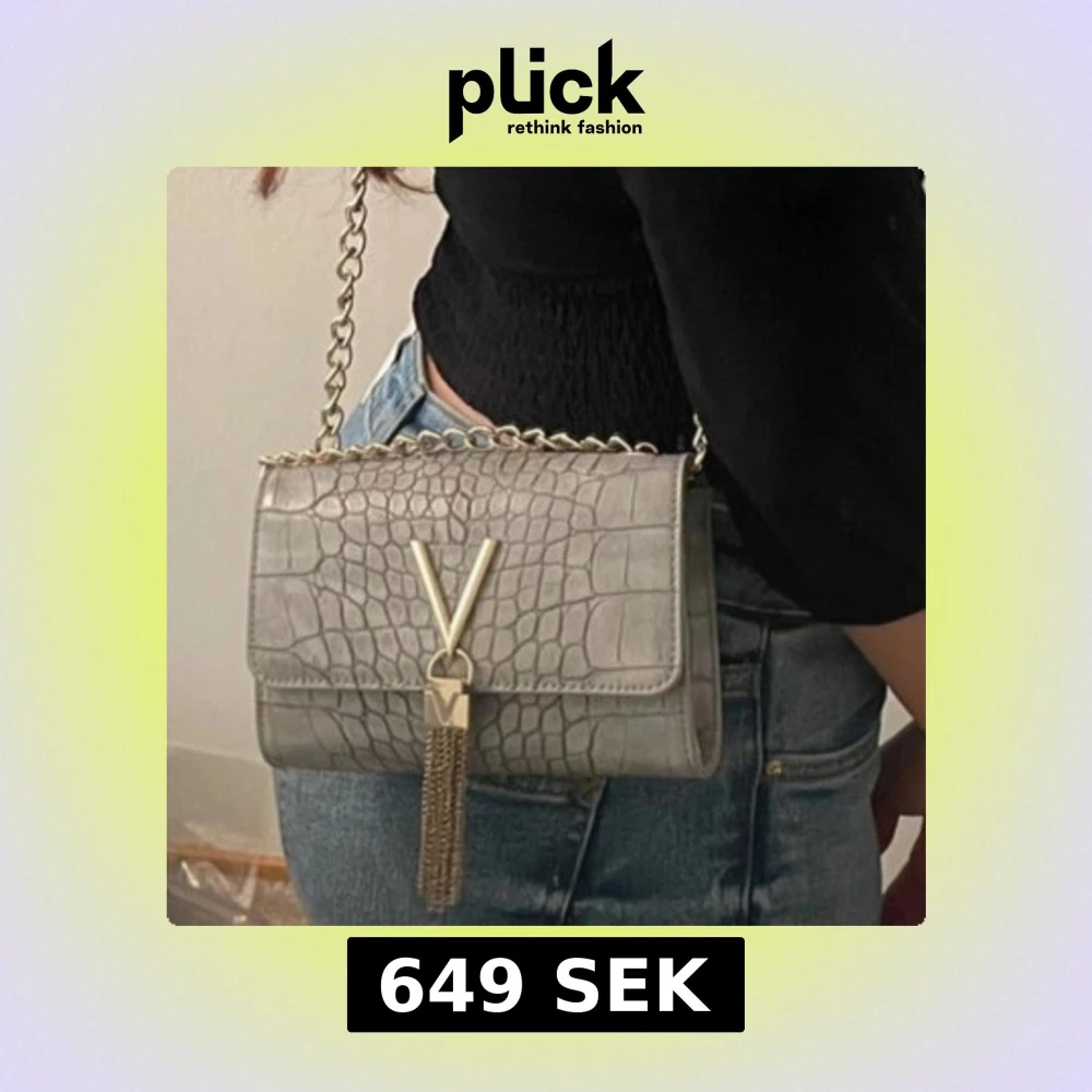 Snygg grå axelväska med krokodilmönster och gulddetaljer. Väskan har en elegant kedjerem och en dekorativ tofs framtill. Perfekt för att ge din outfit en stilfull touch.
