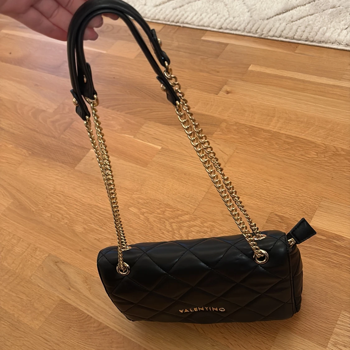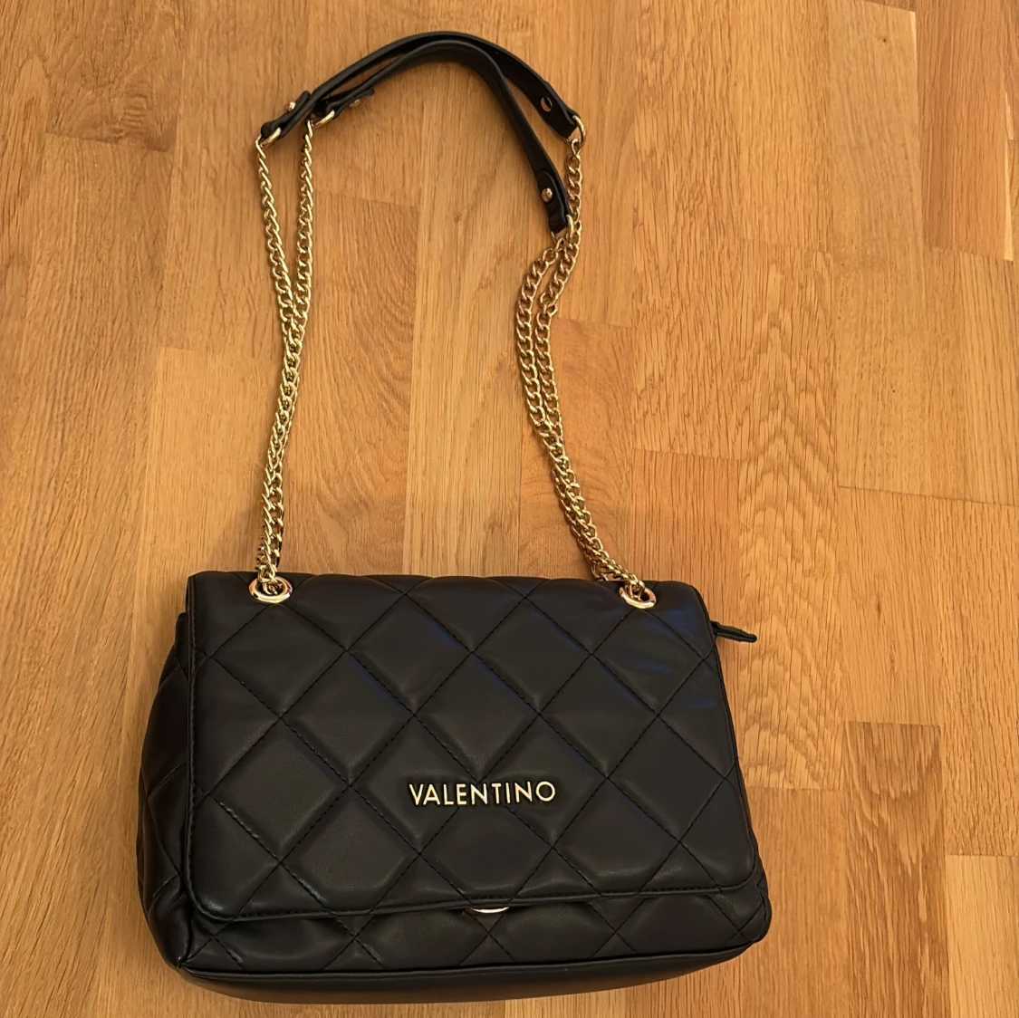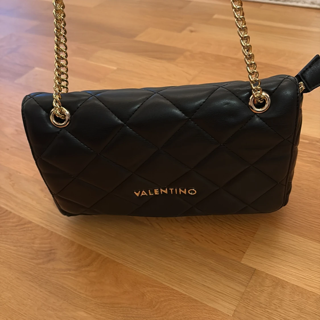 Snygg svart axelväska från Valentino med quiltat mönster och guldfärgade kedjor som axelrem. Väskan är tillverkad i skinnimitation och har ett stilrent, lyxigt uttryck med logga framtill. Perfekt storlek för det viktigaste och en riktig statement piece. Köpt på zalando . Öppen för prisförslag men ej för lågt för den är i för bra skick.