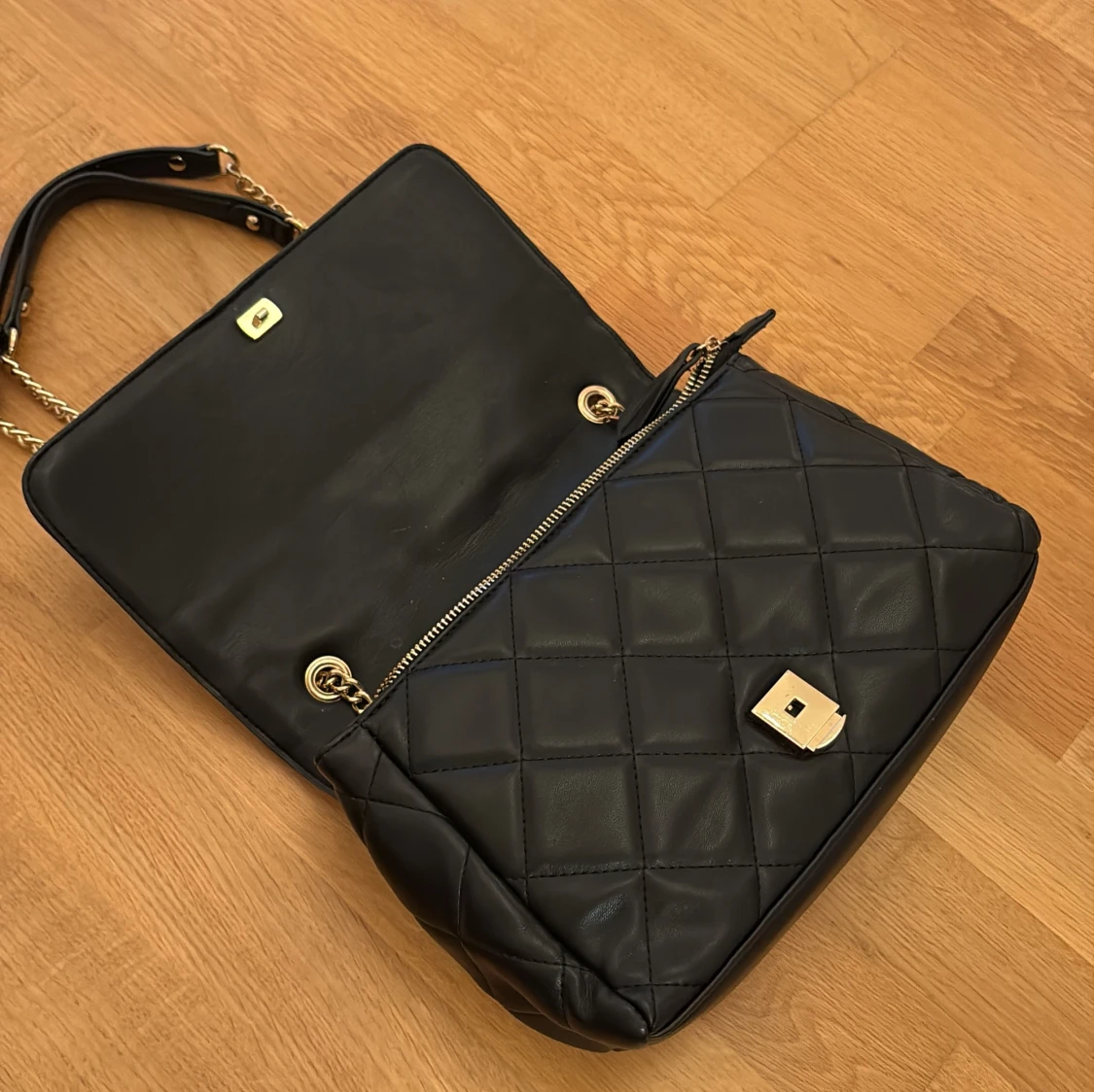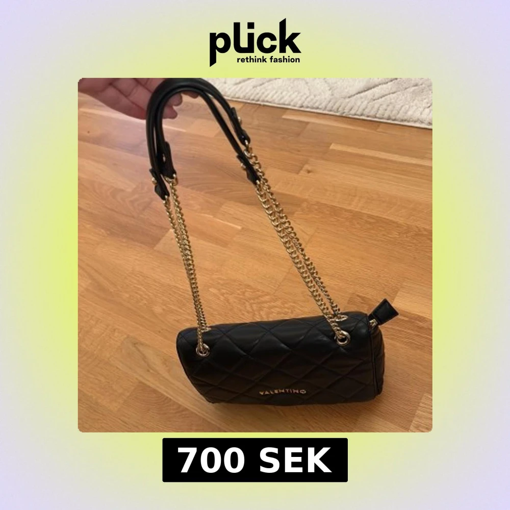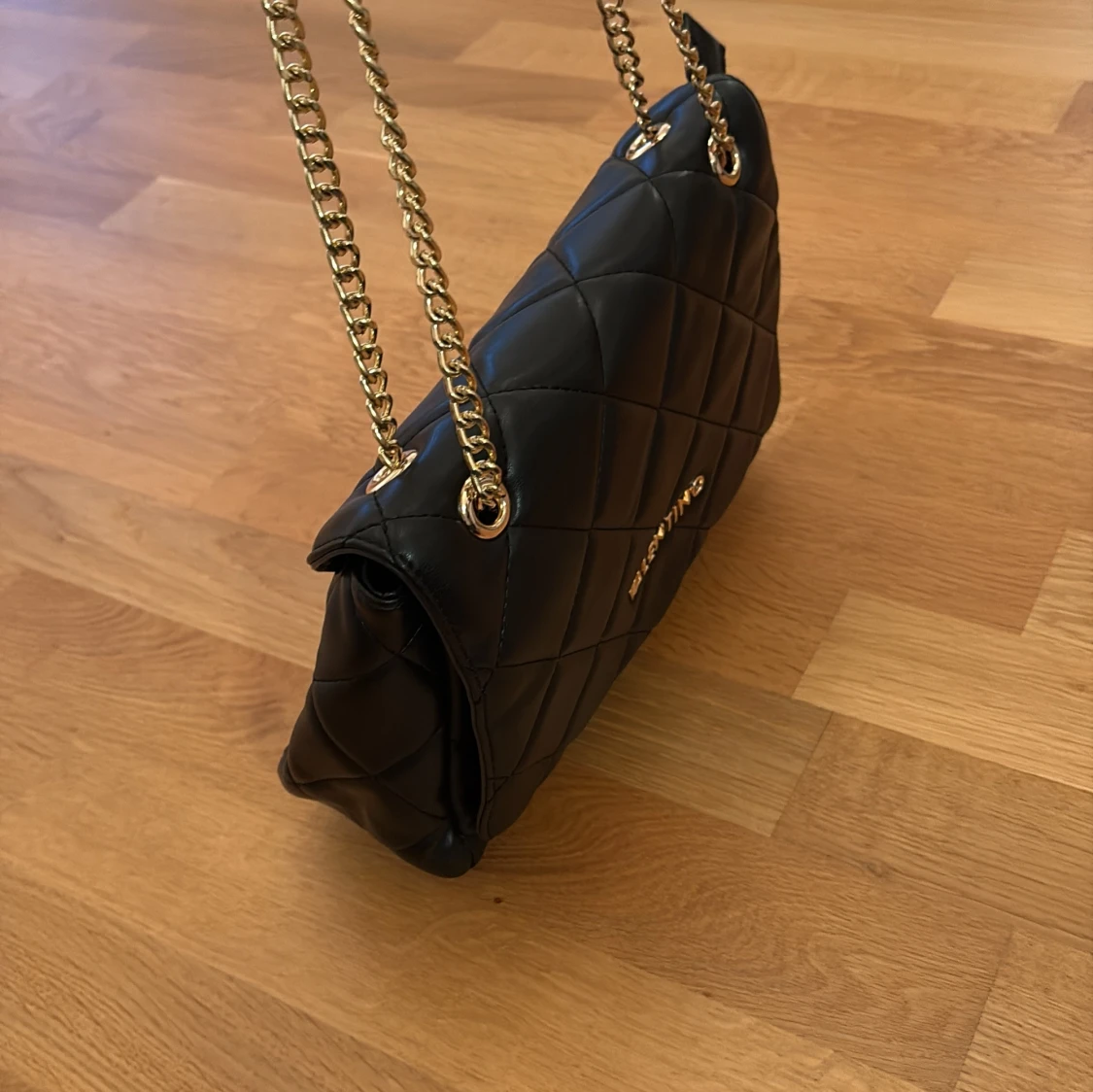 Snygg svart axelväska från Valentino med quiltat mönster och guldfärgade kedjor som axelrem. Väskan är tillverkad i skinnimitation och har ett stilrent, lyxigt uttryck med logga framtill. Perfekt storlek för det viktigaste och en riktig statement piece. Köpt på zalando . Öppen för prisförslag men ej för lågt för den är i för bra skick.