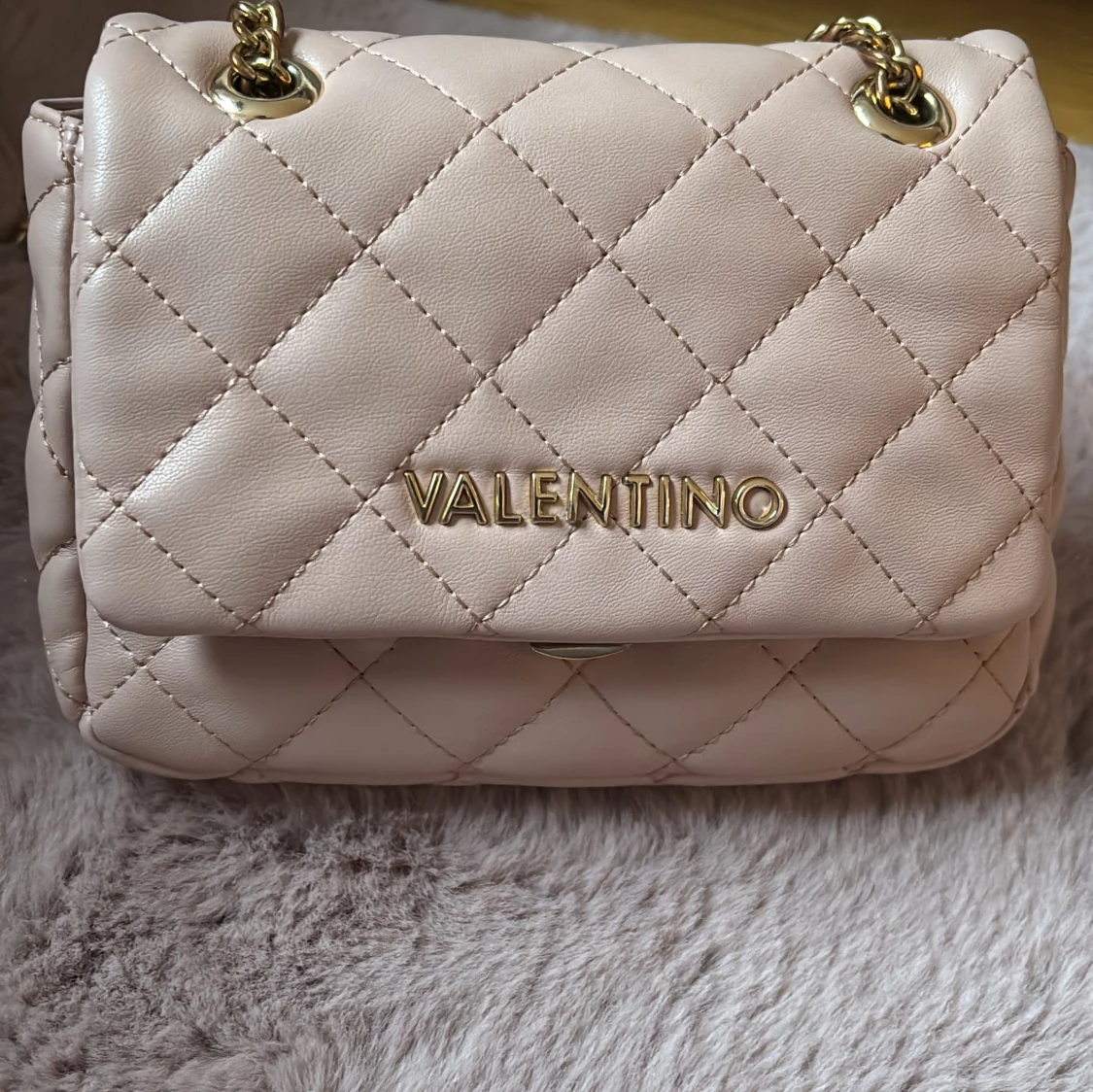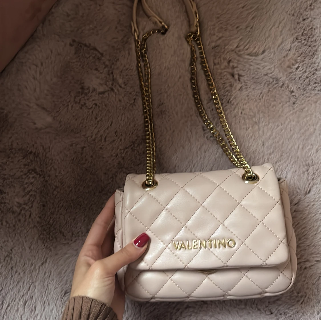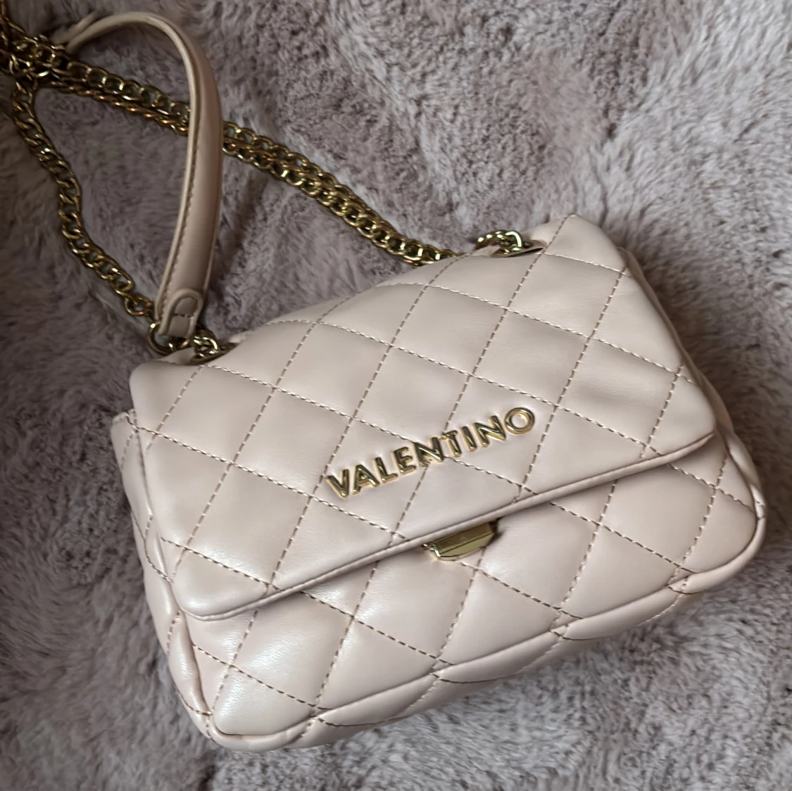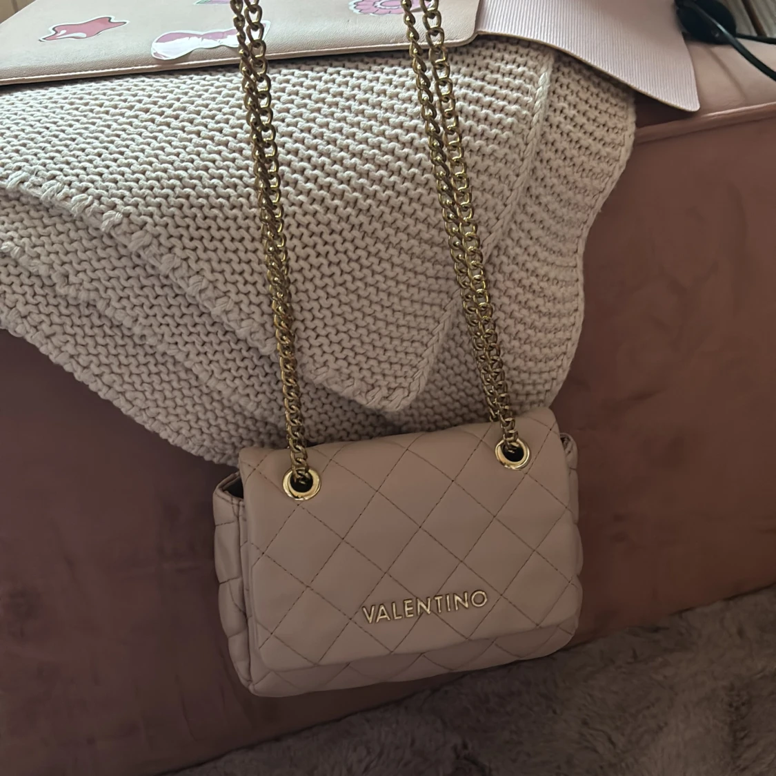 Supersnygg quiltad axelväska från Valentino i ljusbeige skinn med guldfärgade kedjor och detaljer. Väskan har ett klassiskt rutmönster och en stilren design med Valentino-logga framtill. Perfekt storlek för det viktigaste och ger en lyxig touch till din outfit.